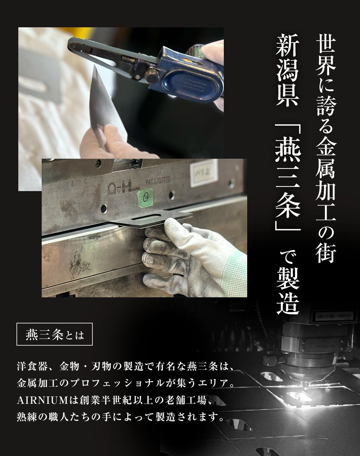 製造は金物産業の街として世界的に有名な新潟県「燕三条」地域で行われます。