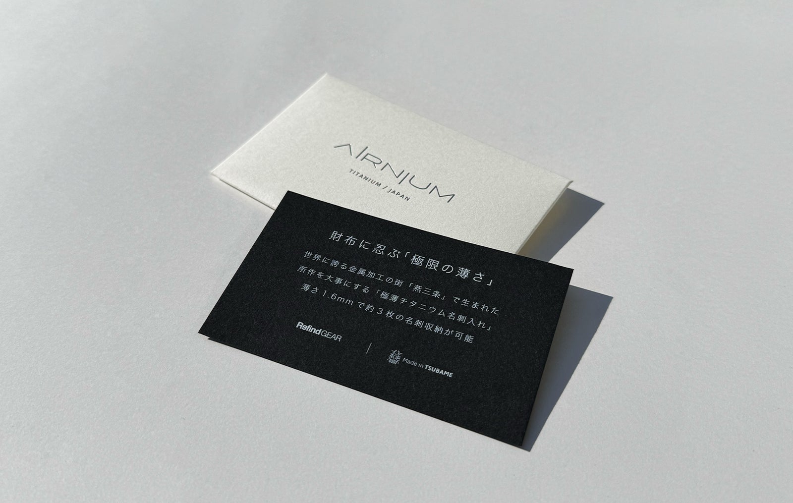 AIRNIUMは予備の名刺を守り、名刺交換の美しい所作へこだわった「財布へ忍ばせる純チタン製名刺入れ」です。