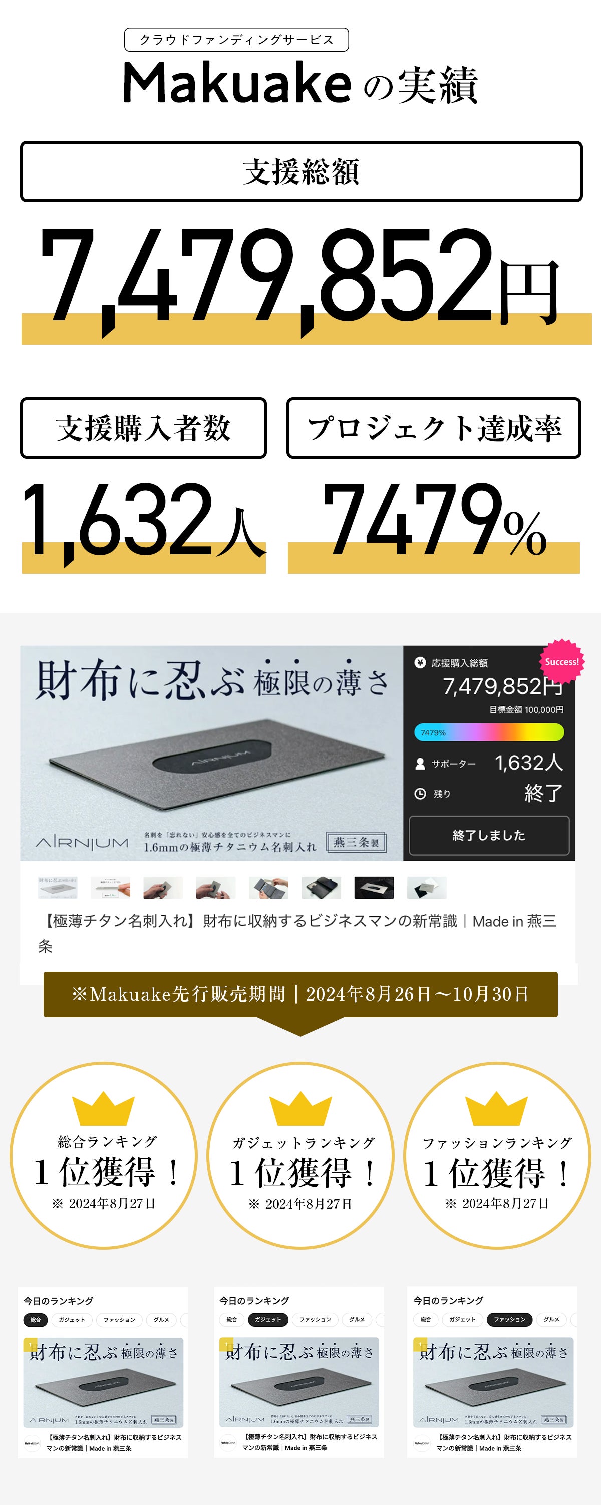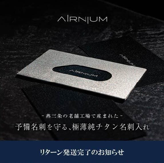 2025/05/19 14:46財布に忍ぶチタン製名刺入れ「AIRNIUM(エアニウム)」の、machi-yaリターンすべての発送手配が完了いたしました。皆様、沢山のご支援誠にありがとうございました。みなさまにいただいた、温かいお言葉や商品へのご意見ご感想、全てありがたく頂戴し、今後の商品開発に生かして私たちの糧とさせていただきます。今後は公式lineにて、まだ未定ではありますがAIRNUMの今後のカラーバリエーションや名入れサービスについて、新商品やお得な情報などを発信していきたいと考えております。https://line.me/R/ti/p/@404lxpzu是非チェックいただけますと嬉しいです! もっと見るAIRNIUMご発送についてのお知らせ ※お届け先情報変更期日