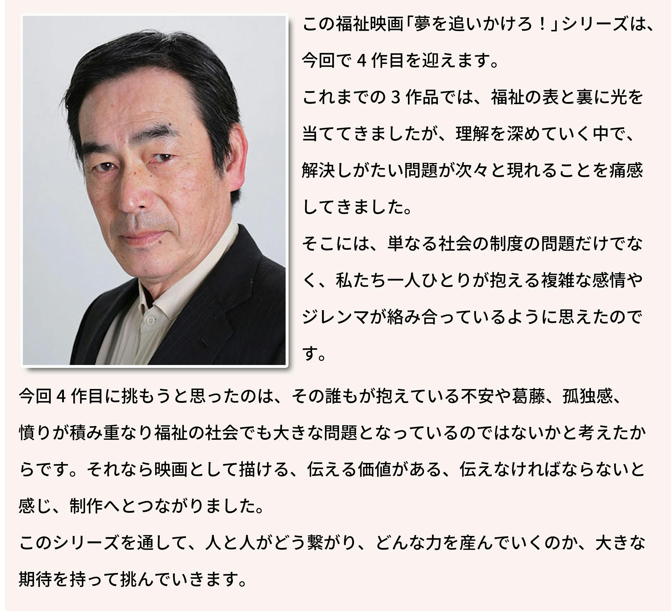 これまで私たちは、福祉をテーマに、社会の理不尽、人間の弱さ、人と人との絆を描き、多くの人にそのメッセージを届けたいと思い、このシリーズを制作してきました。