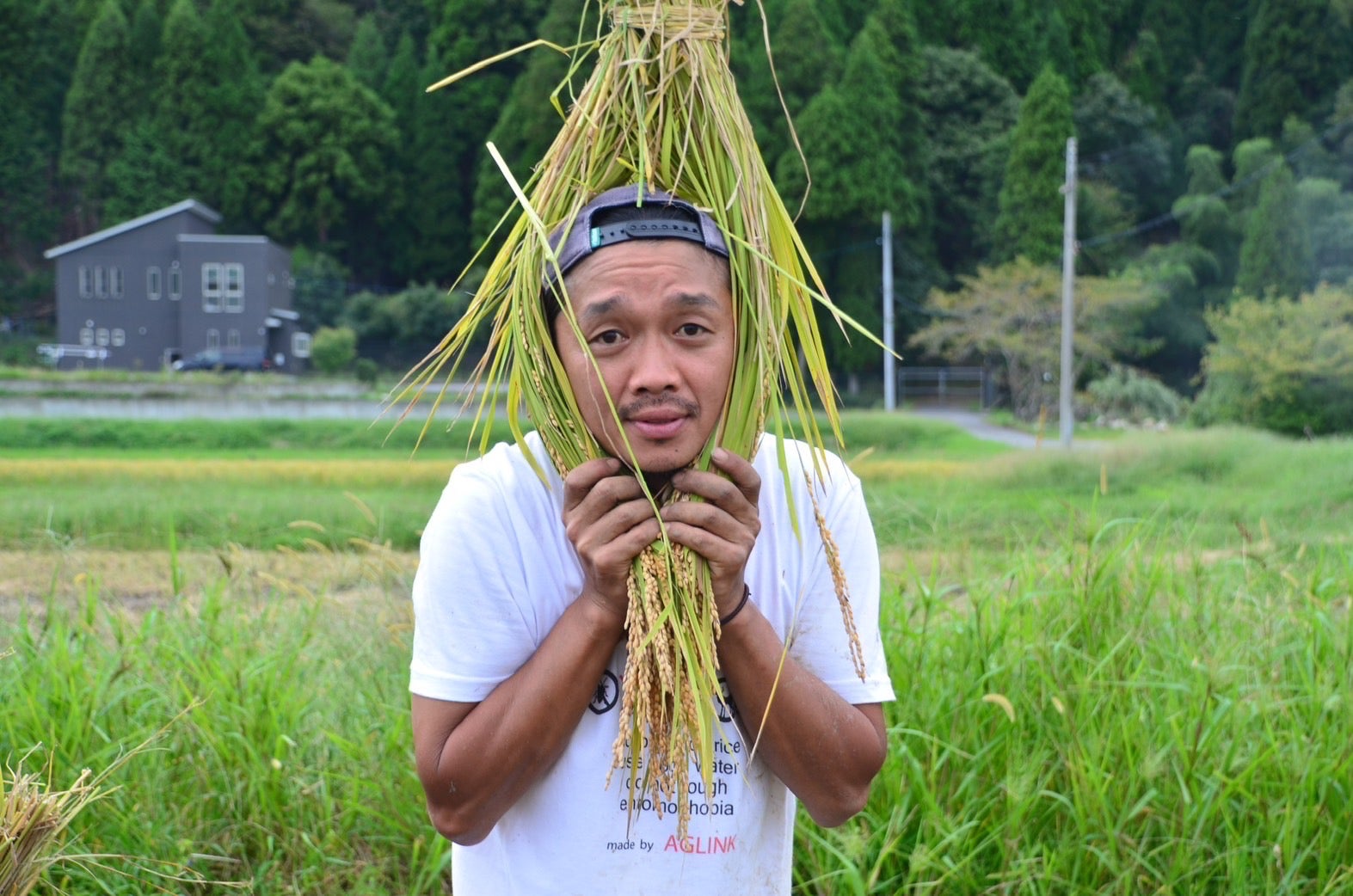 ムードメーカーであるワンスラの中筋さん。「RICE IS COMEDY」というコンセプトは、チャップリンの「LIFE IS COMEDY〜人生は近くで見れば悲劇、遠くから見れば喜劇〜」という言葉にリスペクトを受け、農業の困難を笑いに変えようという思いを込めたものです。