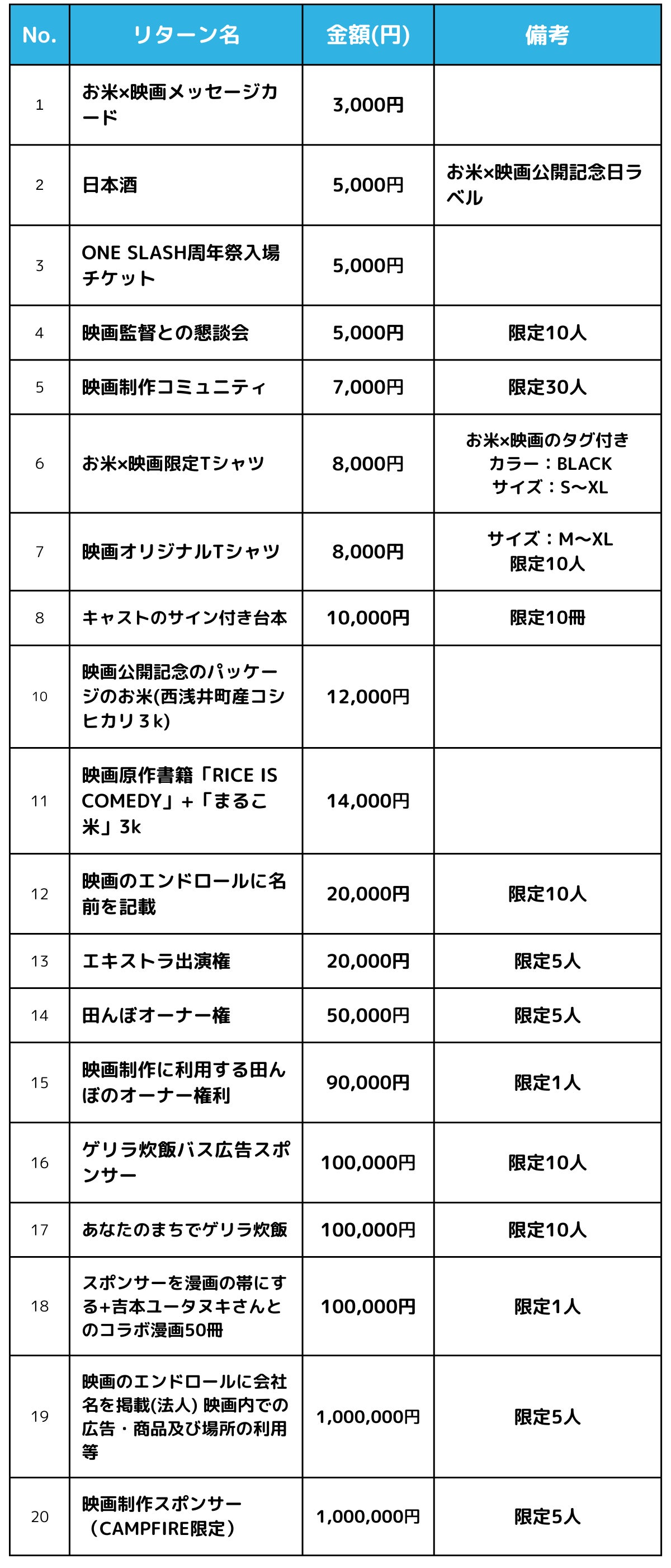 リターンは、以下の通りです。ゲリラ炊飯など参加者の皆さんが楽しみながら農業の価値に触れることができる内容も揃えておりますので、ぜひご支援よろしくお願いします!