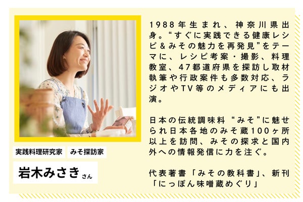協力してくれるのは、実践料理研究家で「みそ探訪家」の肩書きを持つ岩木みさきさん。日本料理に欠かせない調味料にも関わらず、じつは酒に比べて専門家が少ない味噌。そんな味噌に着目し、日本各地の味噌蔵を訪ね歩いて日々の食事に味噌を摂り入れるうちに、肌の調子や体調がどんどんよくなっていったといいます。以来、ますます味噌に魅せられ、その魅力を国内外の多くの人に伝える活動を続けておられます。
