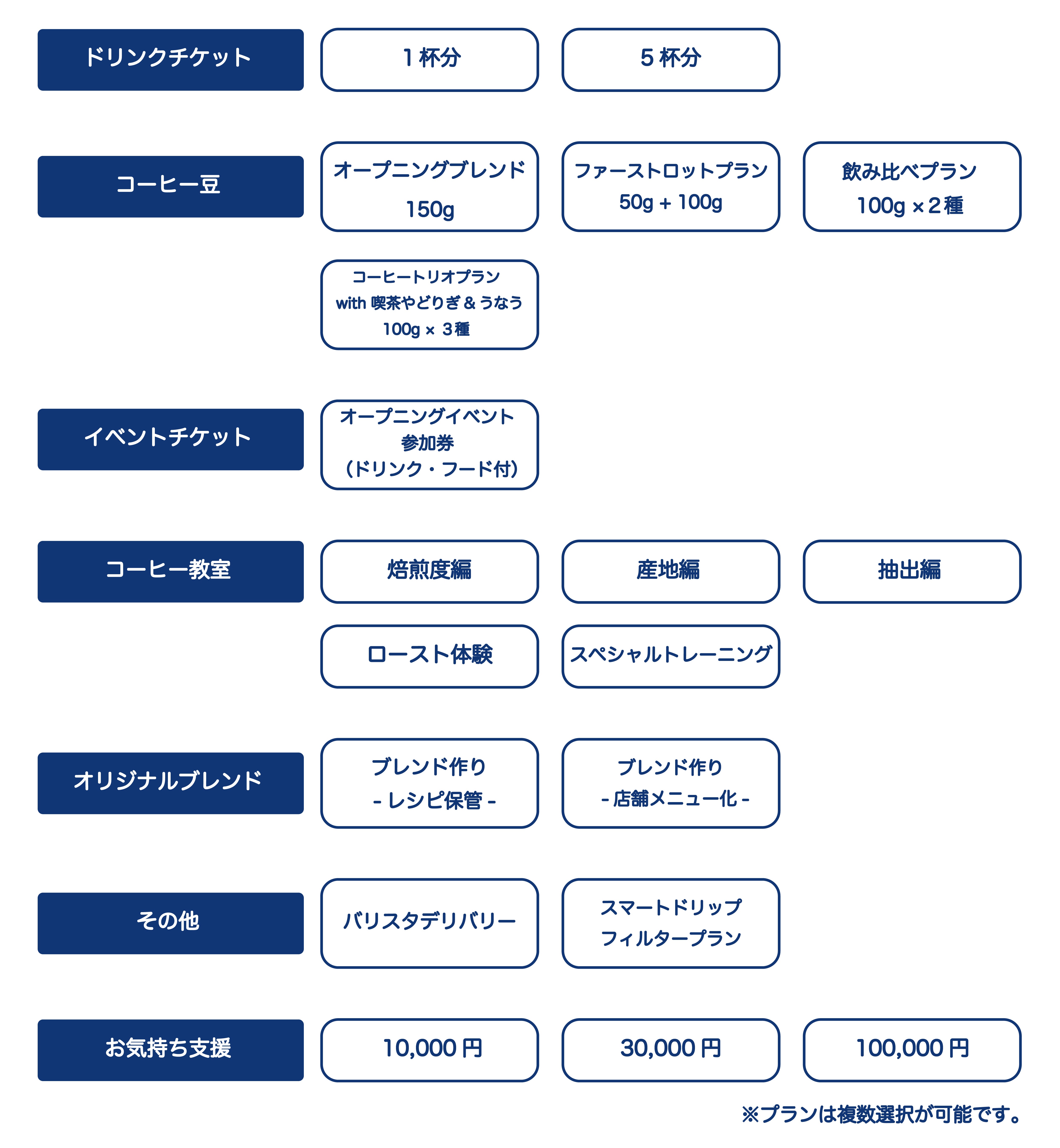 コーヒー豆の詰め合わせセット、焙煎体験やオリジナルブレンド作りなど、限定のリターンを数多くご用意させていただきました!