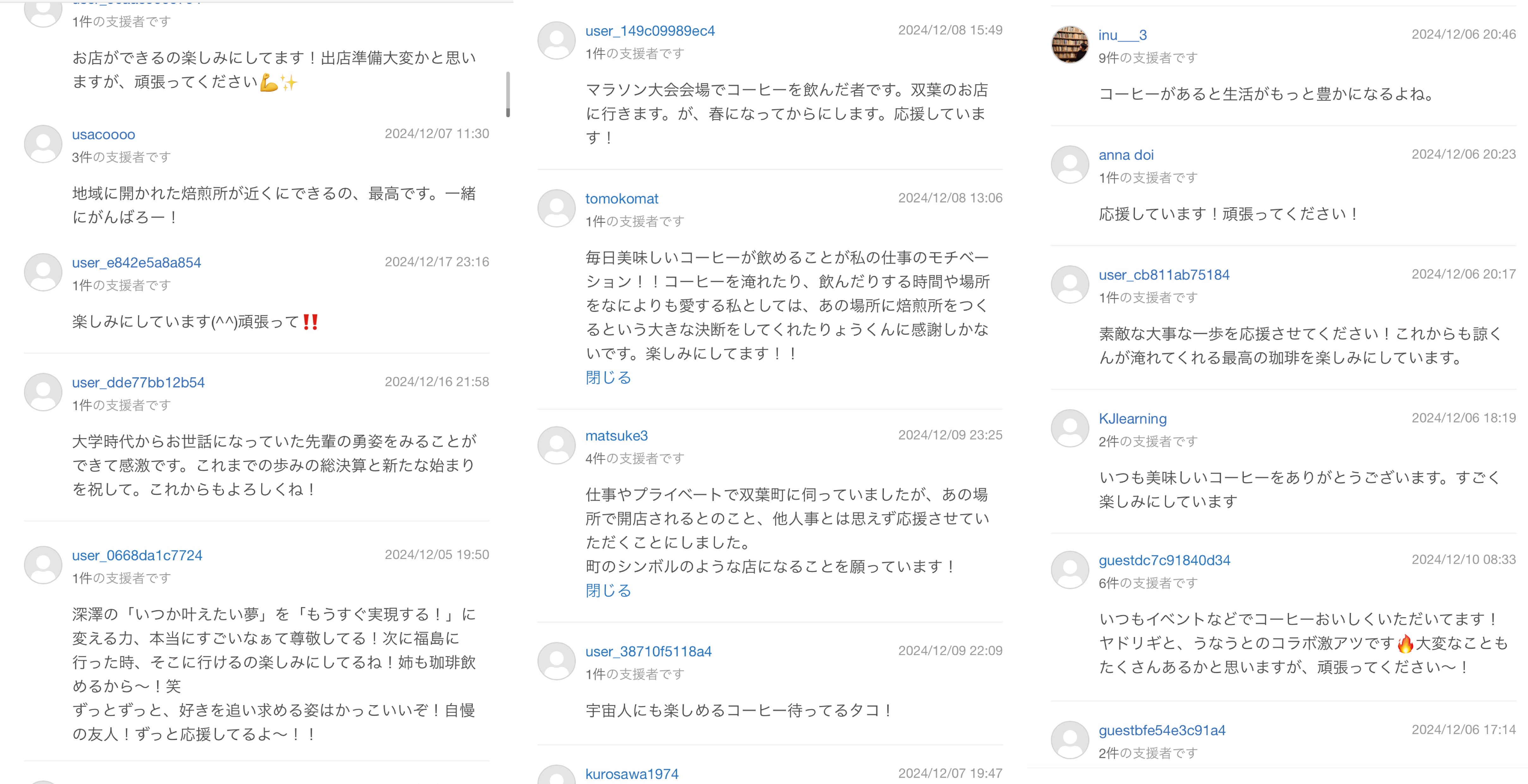 現在たくさんの支援をいただくと共に、応援コメントや応援の声をいただいています。