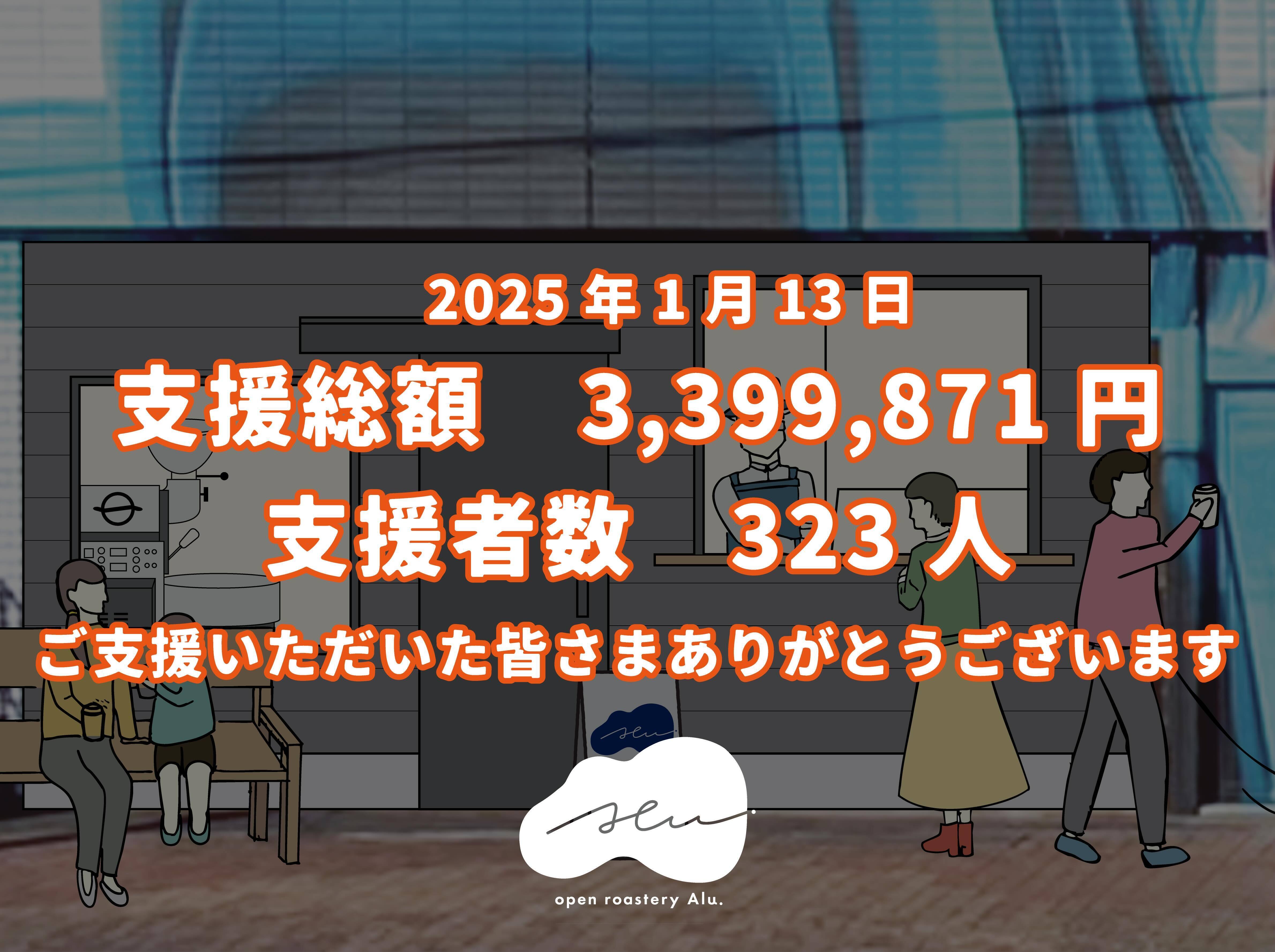 昨日、無事1ヶ月半のクラファン期間が終了しました。ご支援・ご協力いただいた皆さま、本当にありがとうございました!支援総額 3,399,871円(169%)支援者数 323名大変多くの方にご協力いただき、心から感謝しております。何より皆さまと一緒にこの地域で新しい旅を始められることを、大変嬉しく思います。まずは一月後の開業に向けて、精一杯準備をがんばります。2月23日のオープニングイベントは参加券必須となっておりますが、翌24日からはドリンクスタンドの通常営業を始める予定です。ぜひお近くにお越しの際はお立ち寄りいただければと思います。オープニングウィーク中は他にも小さなイベントを企画しておりますので、ご都合が合いましたらぜひご参加ください。3月以降の営業日については追ってご案内いたします。改めまして、たくさんのご支援とご協力、本当にありがとうございました!これからも引き続き、どうぞよろしくお願いいたします!open roastery Alu. 深澤 諒
