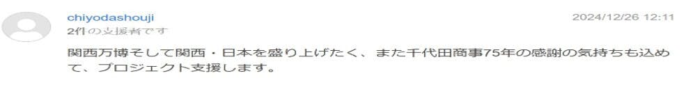 2025/01/12 17:58chiyodashouji様この度はご支援ありがとうございます。同じ兵庫県姫路市の企業の千代田商事様よりのご支援まことに感謝いたします。大阪万博への挑戦は、日本の文化を世界にということもありますが、地元姫路市・兵庫県も盛り上げていきたいという想いもあり挑戦を決意いたしました。兵庫が盛り上がるよう全力をもって万博を成功させます!まねき食品株式会社 万博プロジェクト担当 田辺 佑樹 もっと見る