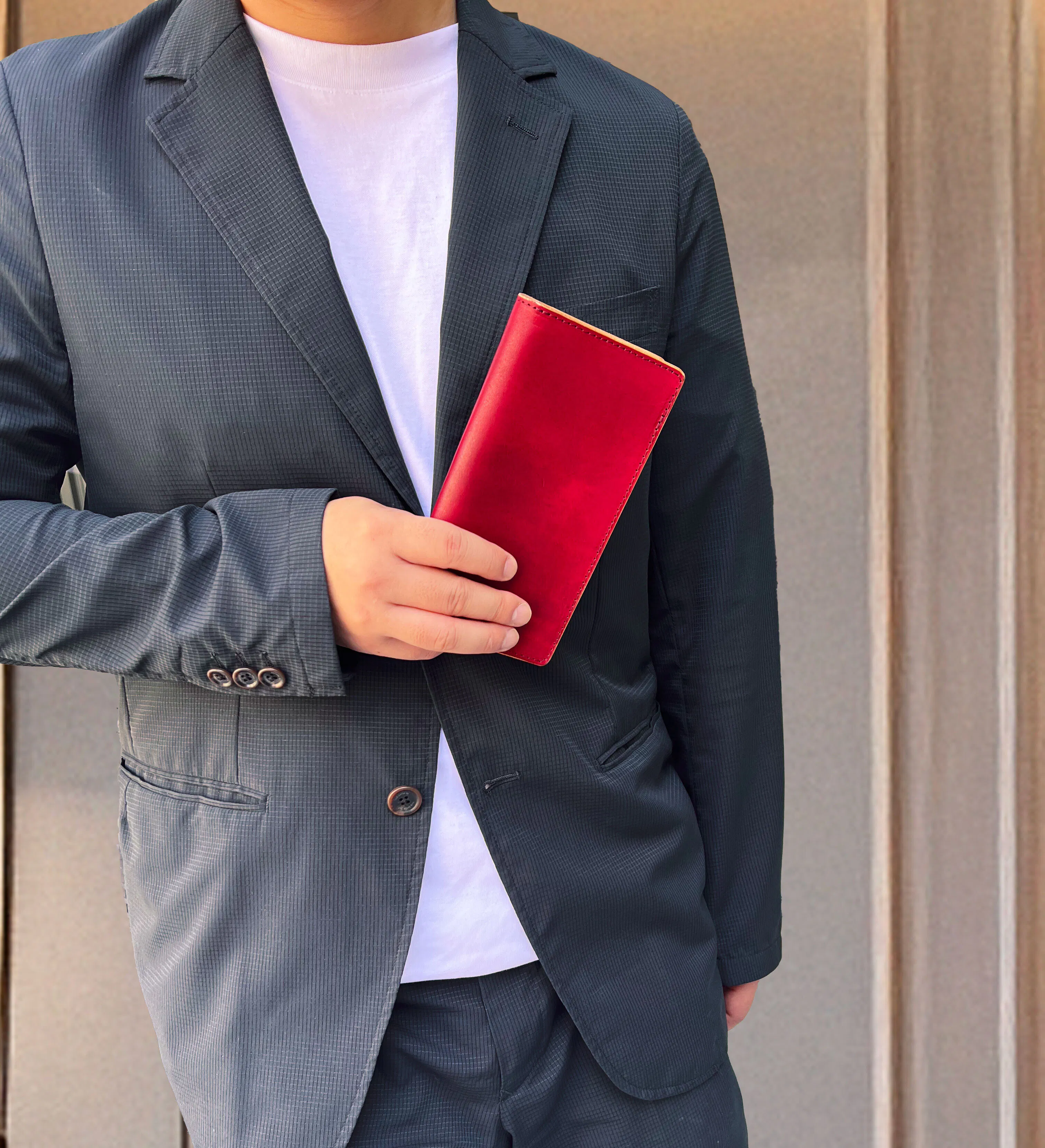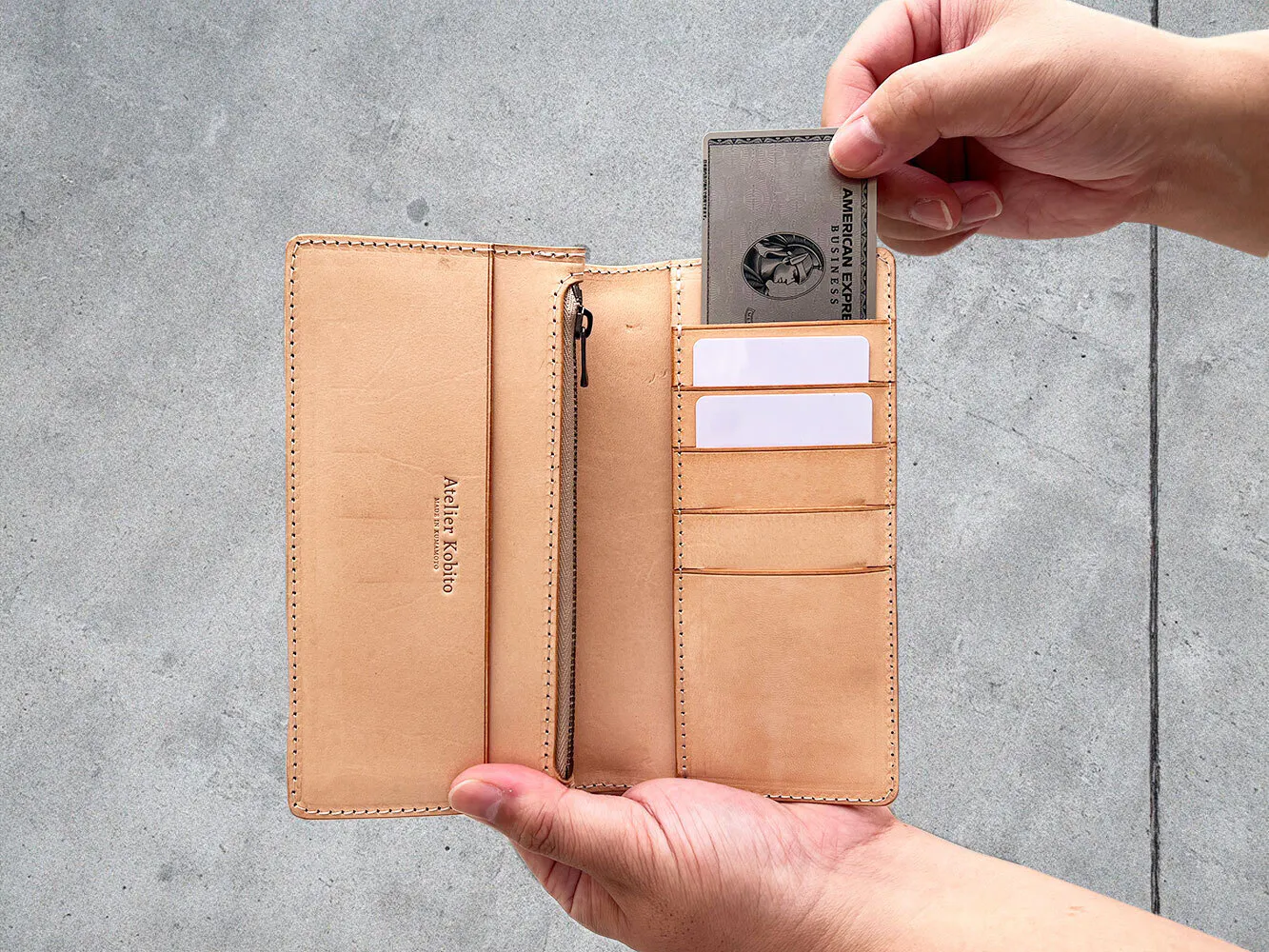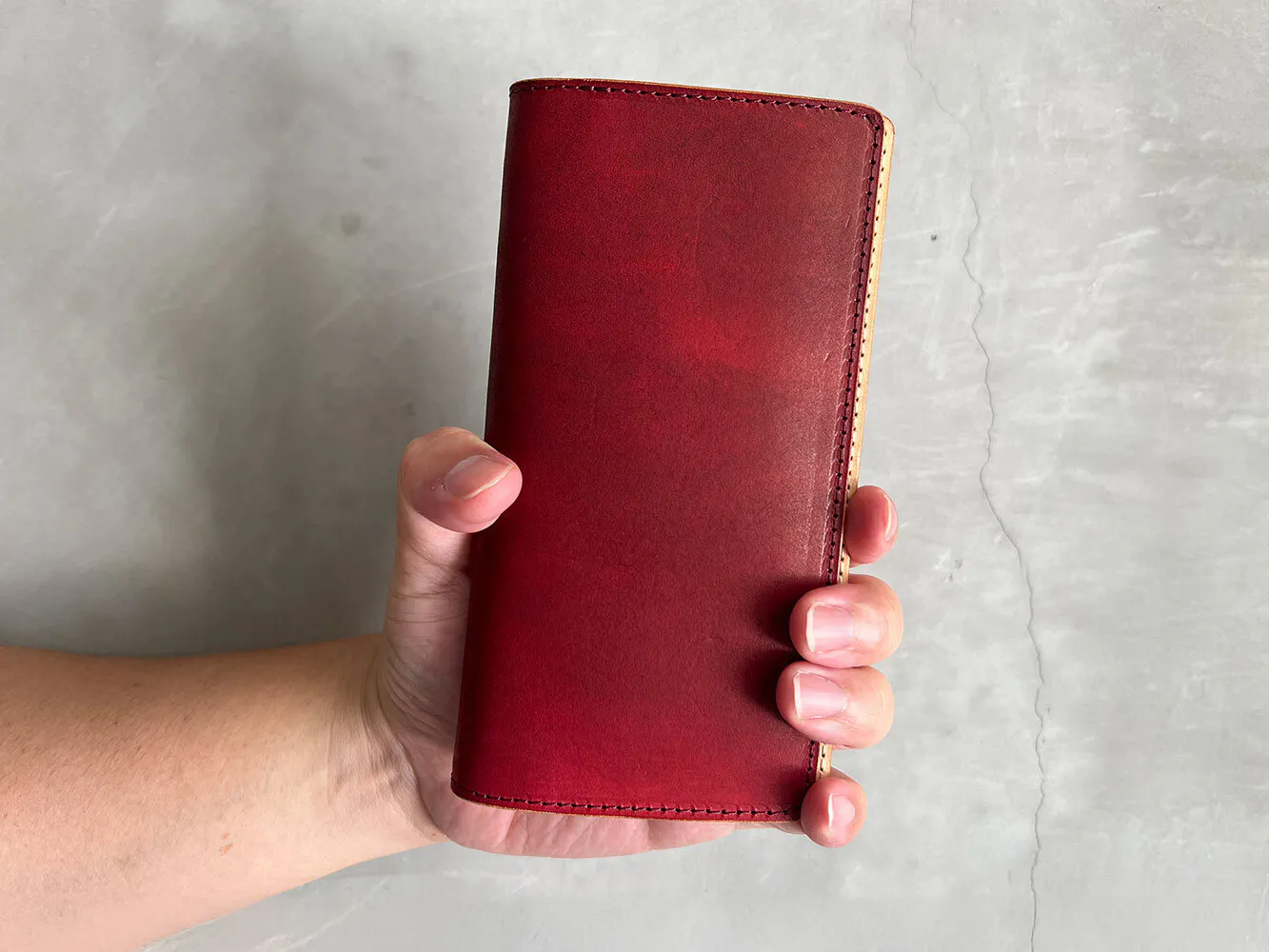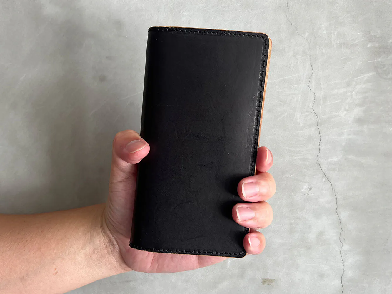 今回製作する長財布は、一般的な既製品よりもコンパクトなサイズ感が特徴です。