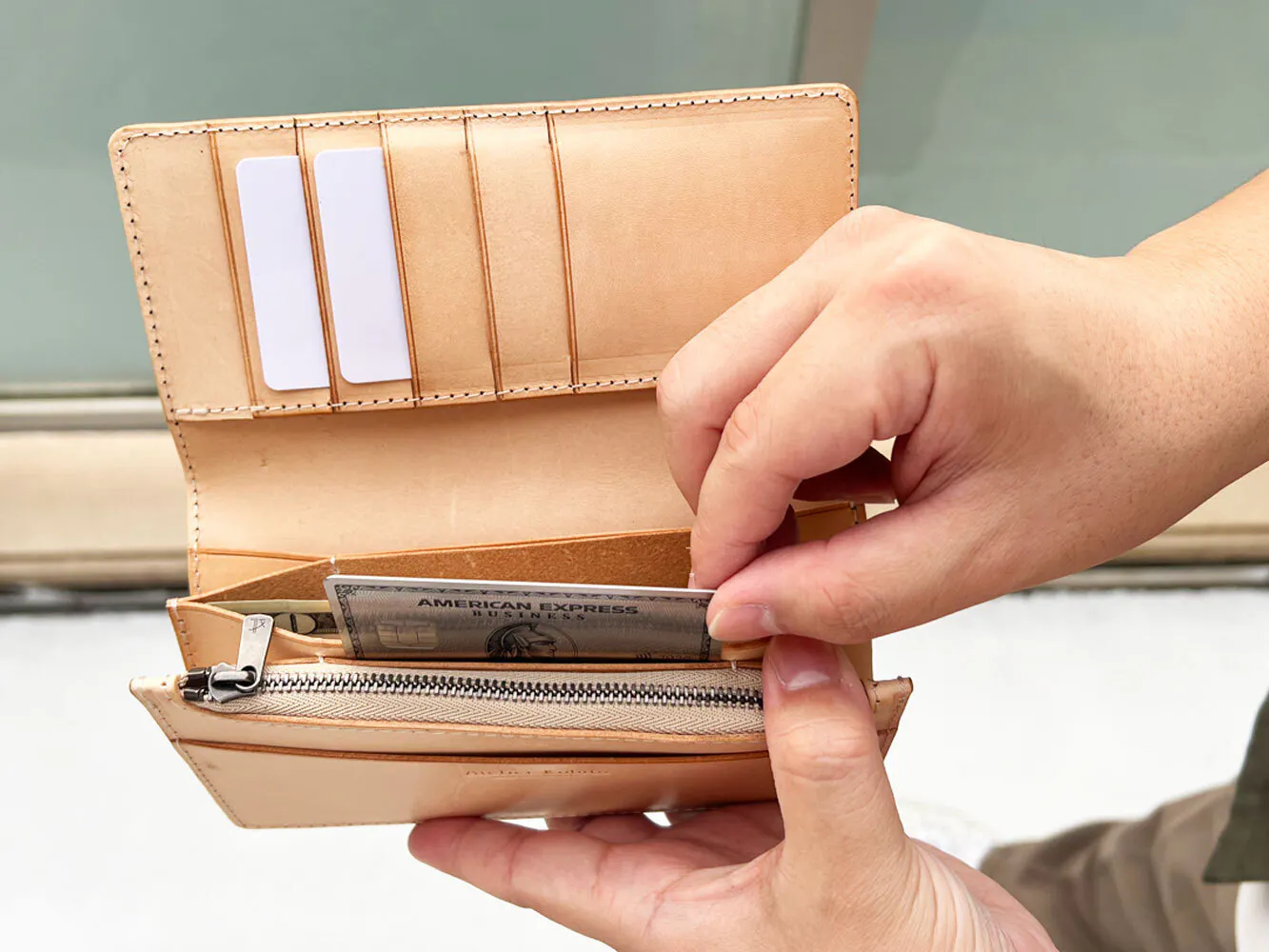 ②紙幣やカード入れの横幅がギリギリで出し入れがしにくい、ポケットも足りないから10枚もカード入らない。