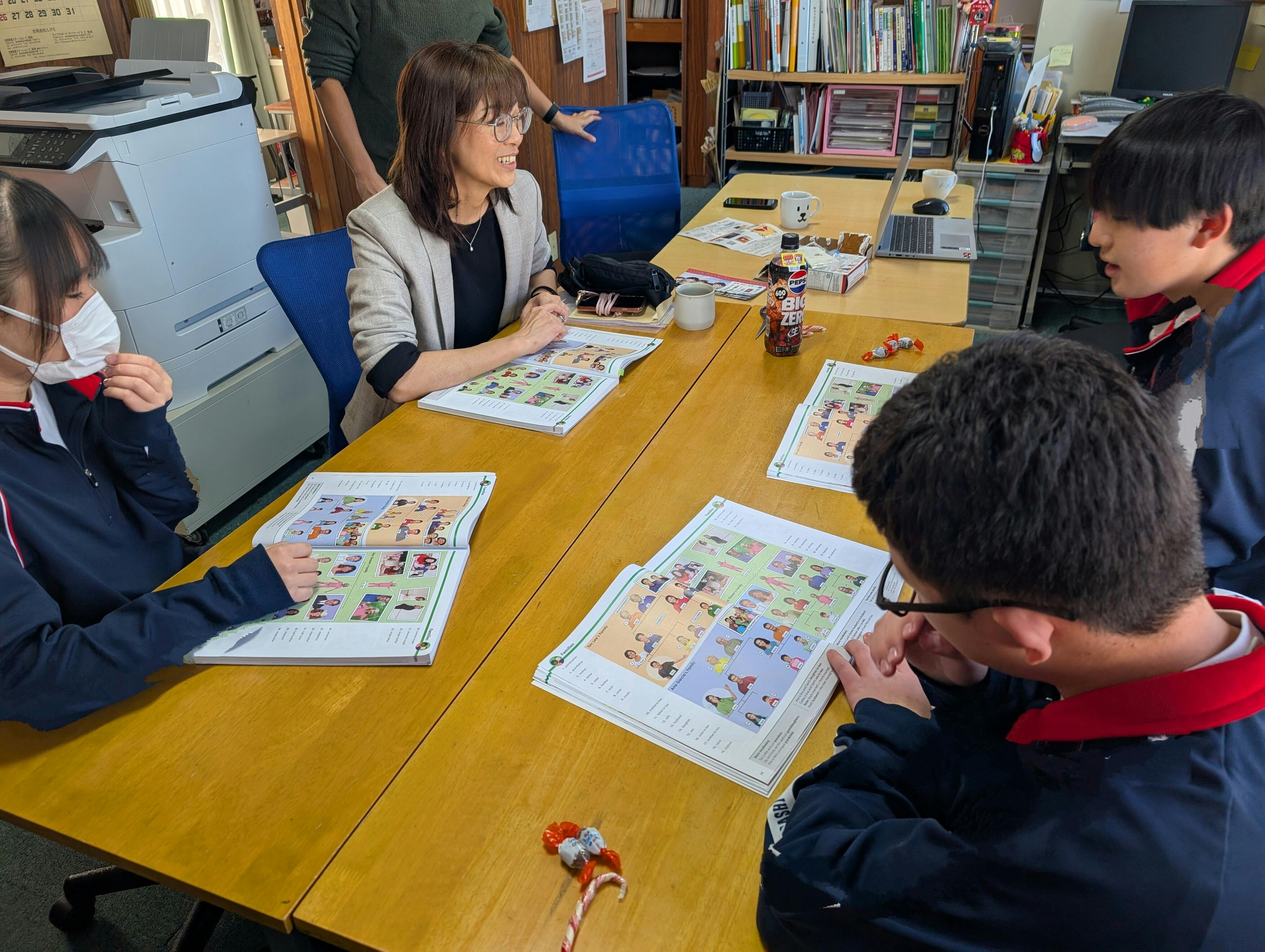 「写真を見て説明する」レッスンでは、自分の知っている英語と文法を頼りに説明します。辞書は引きません。言葉に詰まると、他の生徒たちが助け舟を出します。3人のチームワークで文を創り上げていくのです。チームで助け合う・・これは、現地に行った時に最大の武器になります。