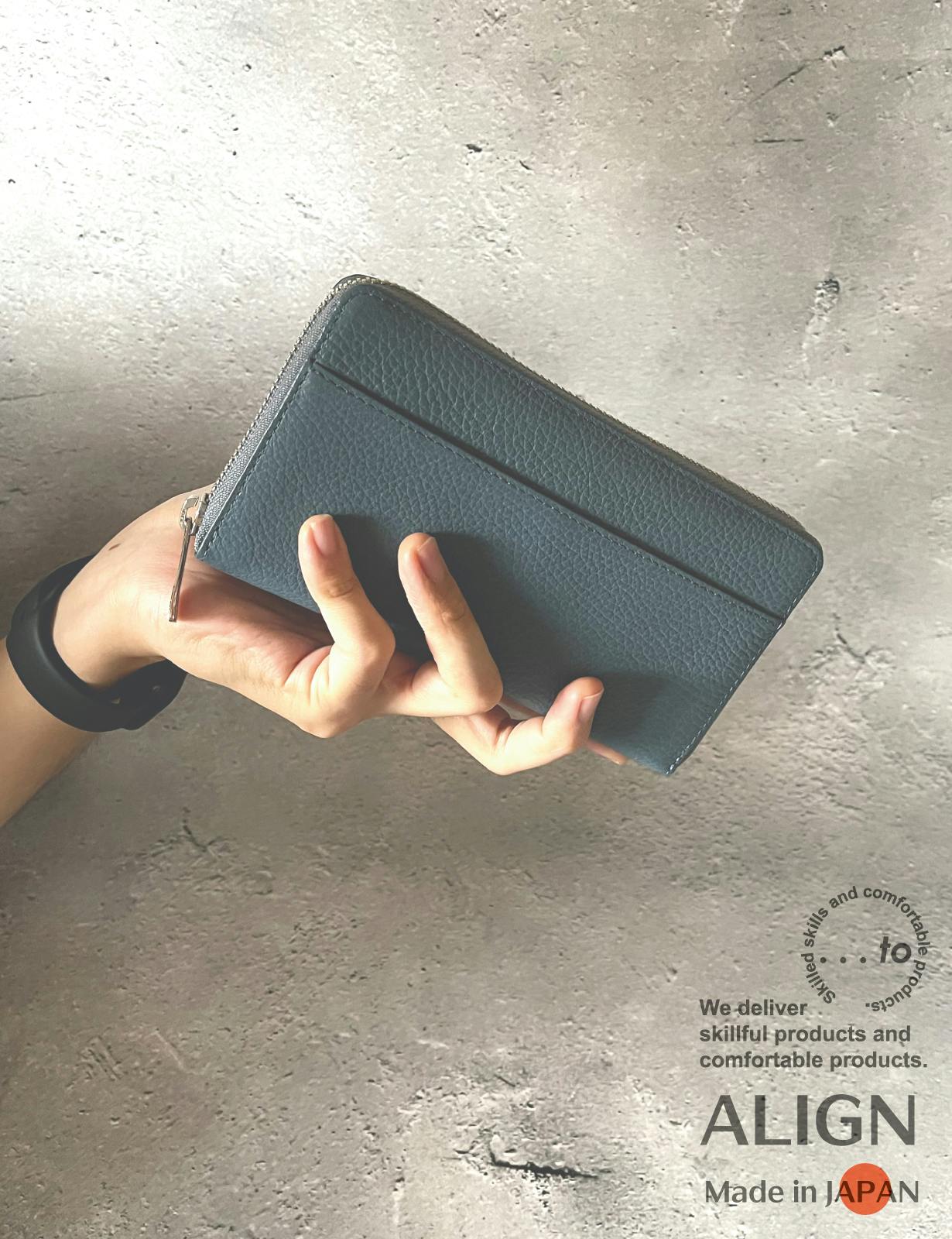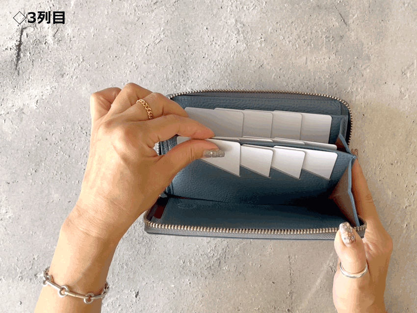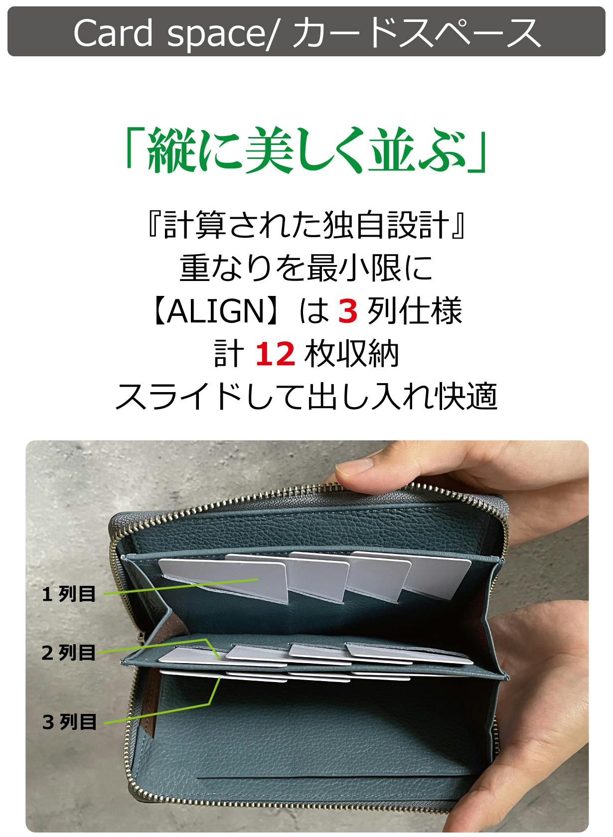 一般的な財布が膨らんでしまう原因は、解説画像の様にカードの厚みが中央に重なってしまう事が要因です。この要因で、ファスナーに負荷がかかり開閉時のすべりが悪くなる場合もあります。「ALIGN(アライン)」は解説画像の様にカード段に4枚入れてもカード同士の重なりが常に2枚になる仕様で厚みが均一になり極端に1部分が膨らんでしまうという現象が起きづらい独自設計。これにより財布自体が崩れにくく膨らみづらくなります。