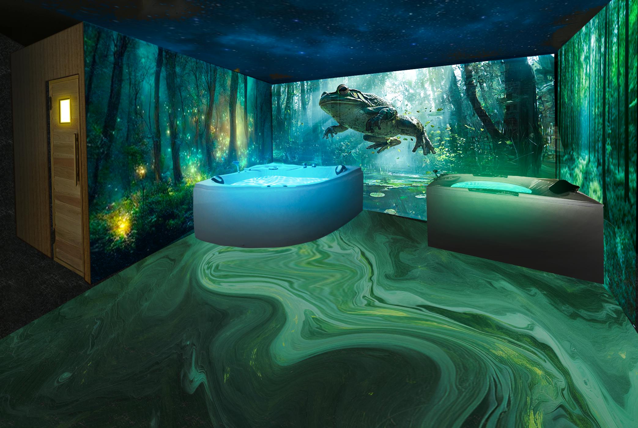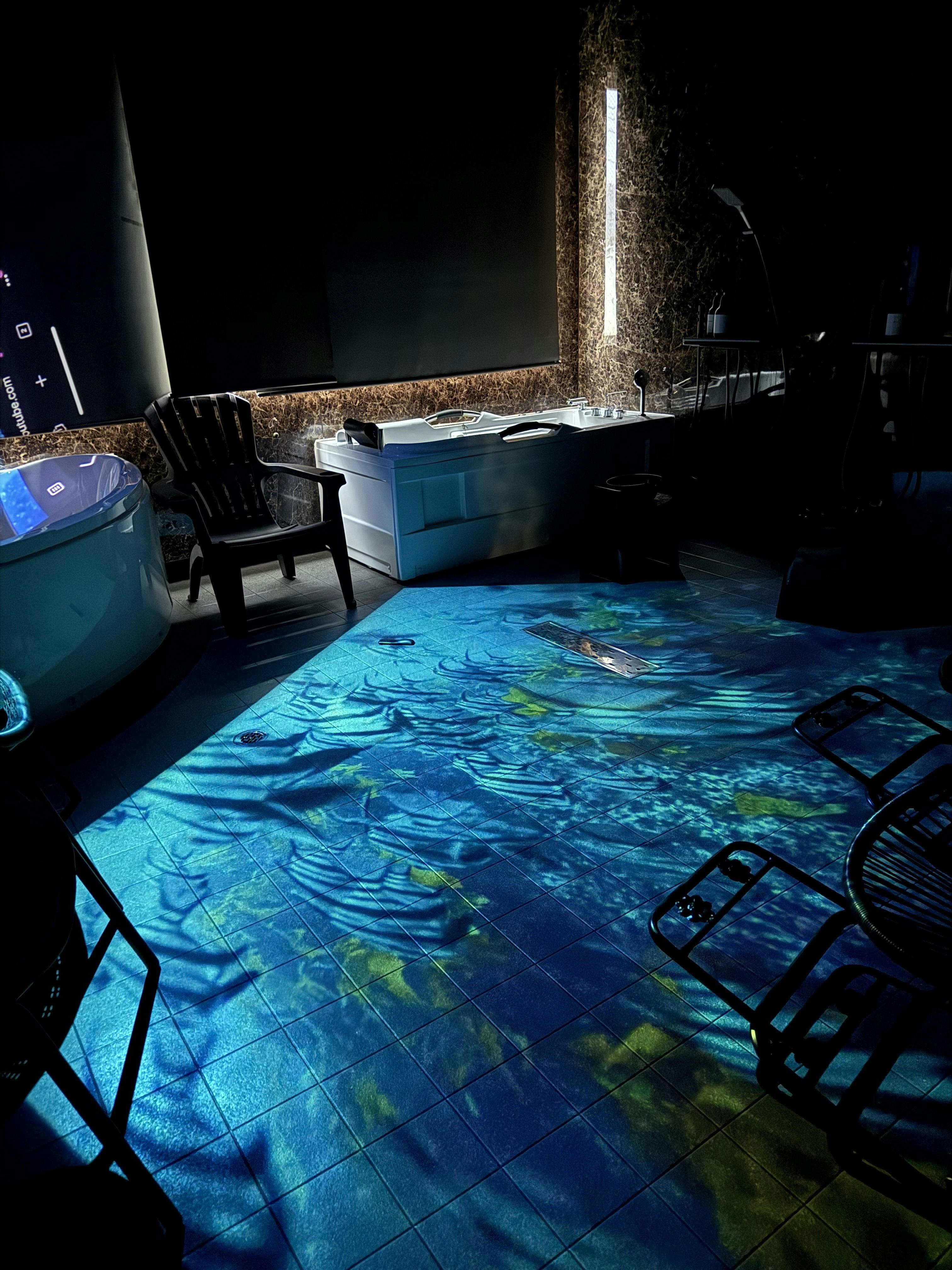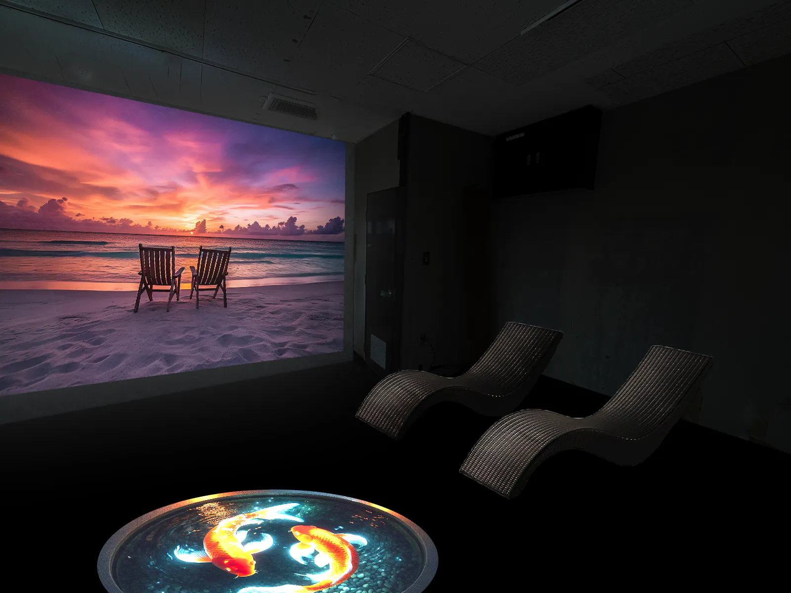 異空間演出においては、映像を使ったプロジェクションマッピングを主に取り入れたいと考えています。始めは、サウナ室内の壁面1面と、ととのいスペースの1面から。