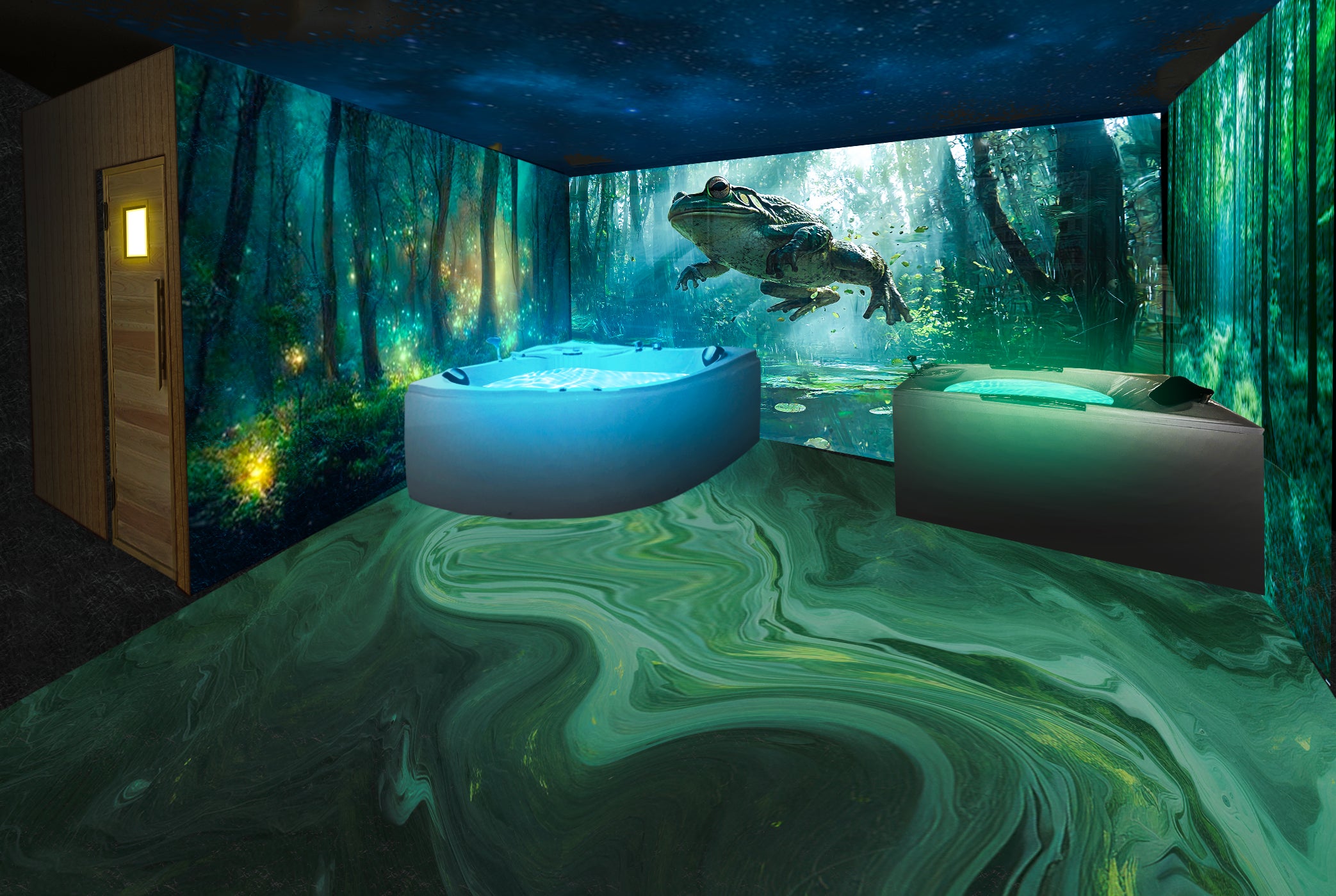 本プロジェクトでは普段の生活を忘れられるような空間演出ができる、3Dプロジェクションマッピングを駆使した佐賀県初の『男性専用サウナ』を作りたいと考えております。