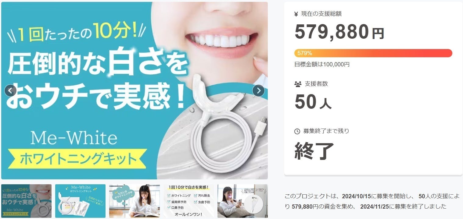 皆様からご支援いただきました資金は引き続きホワイトニングジェルやLEDライトの更なる性能アップ、大量生産による商品価格の改定を目指して、知名度アップまた研究開発費用に充てさせていただければと思います。