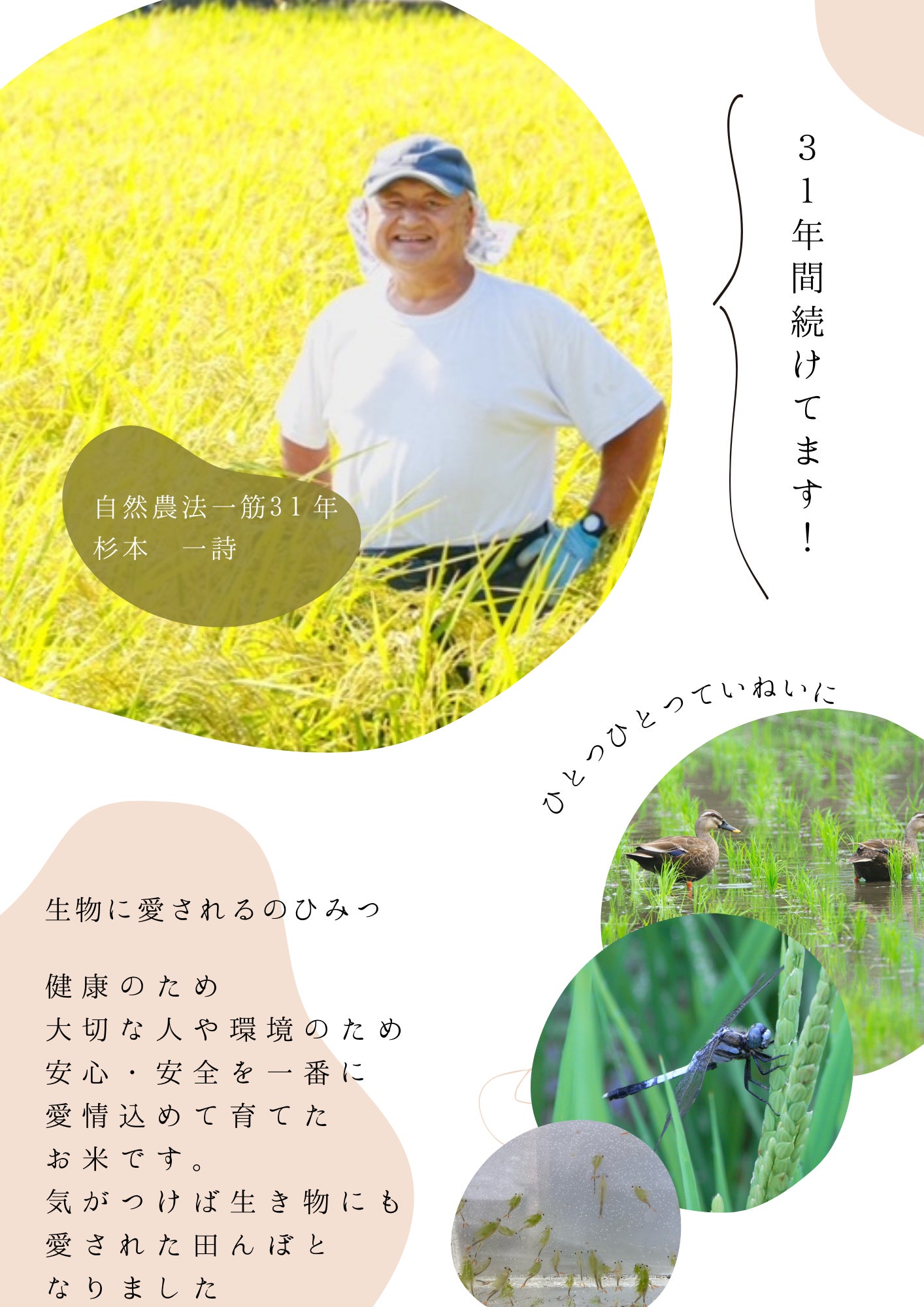 私、杉本一詩は静岡で家業の農家を継いで米作りに携わるようになってから約30年。90年代早々から農薬も除草剤も、そして化学肥料だけでなく有機肥料も使わない究極の自然栽培で米作りを続けております。