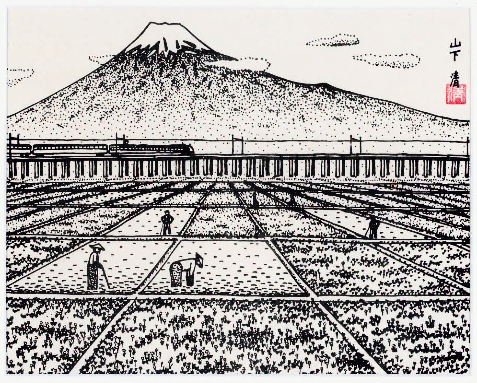 まさかの富士山、田んぼを描いた一枚を発見!!!直ぐに使用許可の連絡をして、数回に及ぶ交渉をしラベル使用の許可も頂きました!!!これも大きな巡り合わせ一粒のお米から日本の巨匠まで辿り着きました!