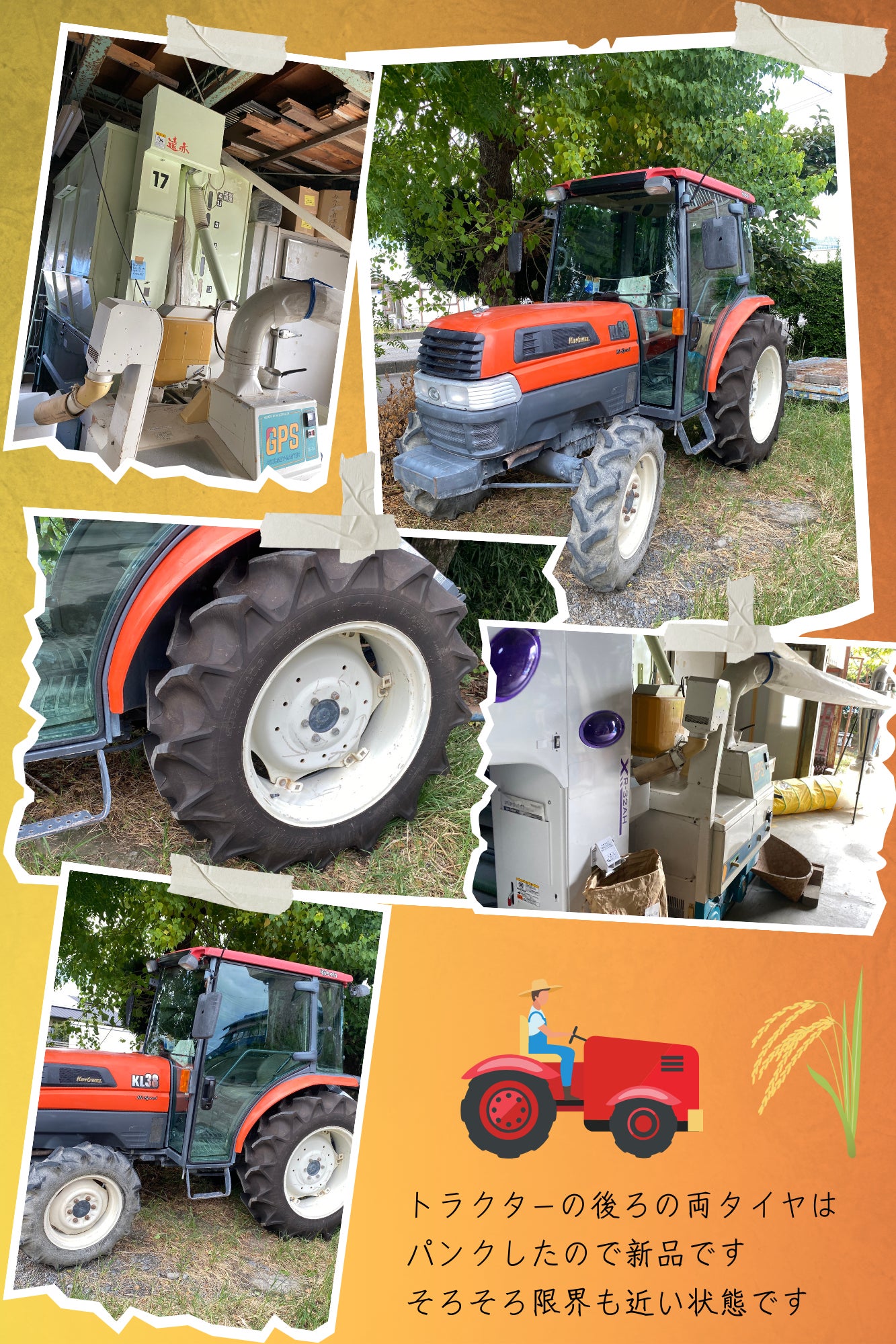 私自身も全速力で駆け抜けた31年間、同じくトラクターや精米機などの機械類もそのまま使い続けてきました。途中何度も修理して騙し騙しで繋いできました。しかし、今年に入りトラクターの両タイヤがとうとうパンクしました、その知らせを受けた時は廃車?!と焦りましたが、一旦タイヤを交換するだけで落ち着きましたが、次は分かりません。トラクターが無くなってしまったら作業がほぼ難しくなります