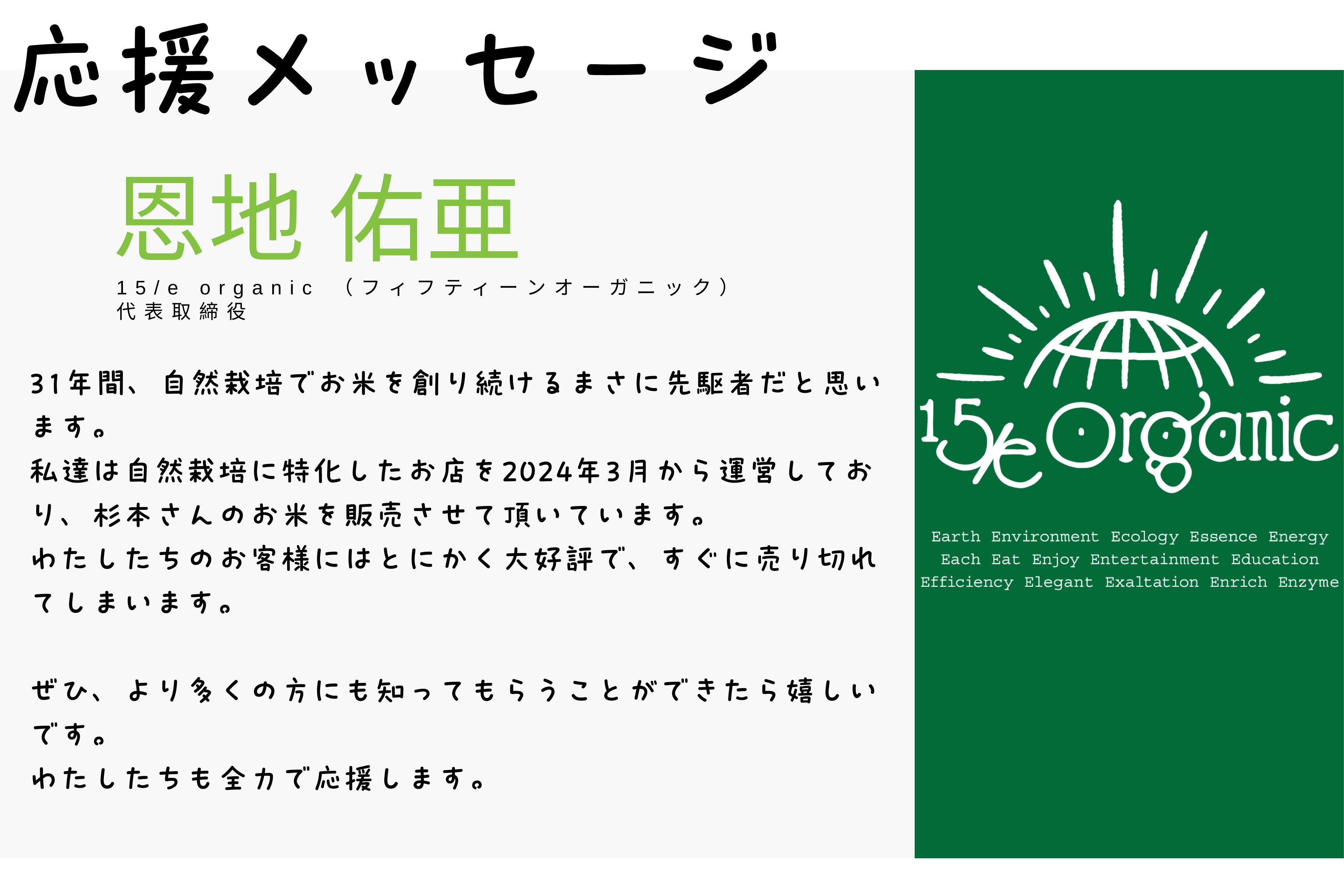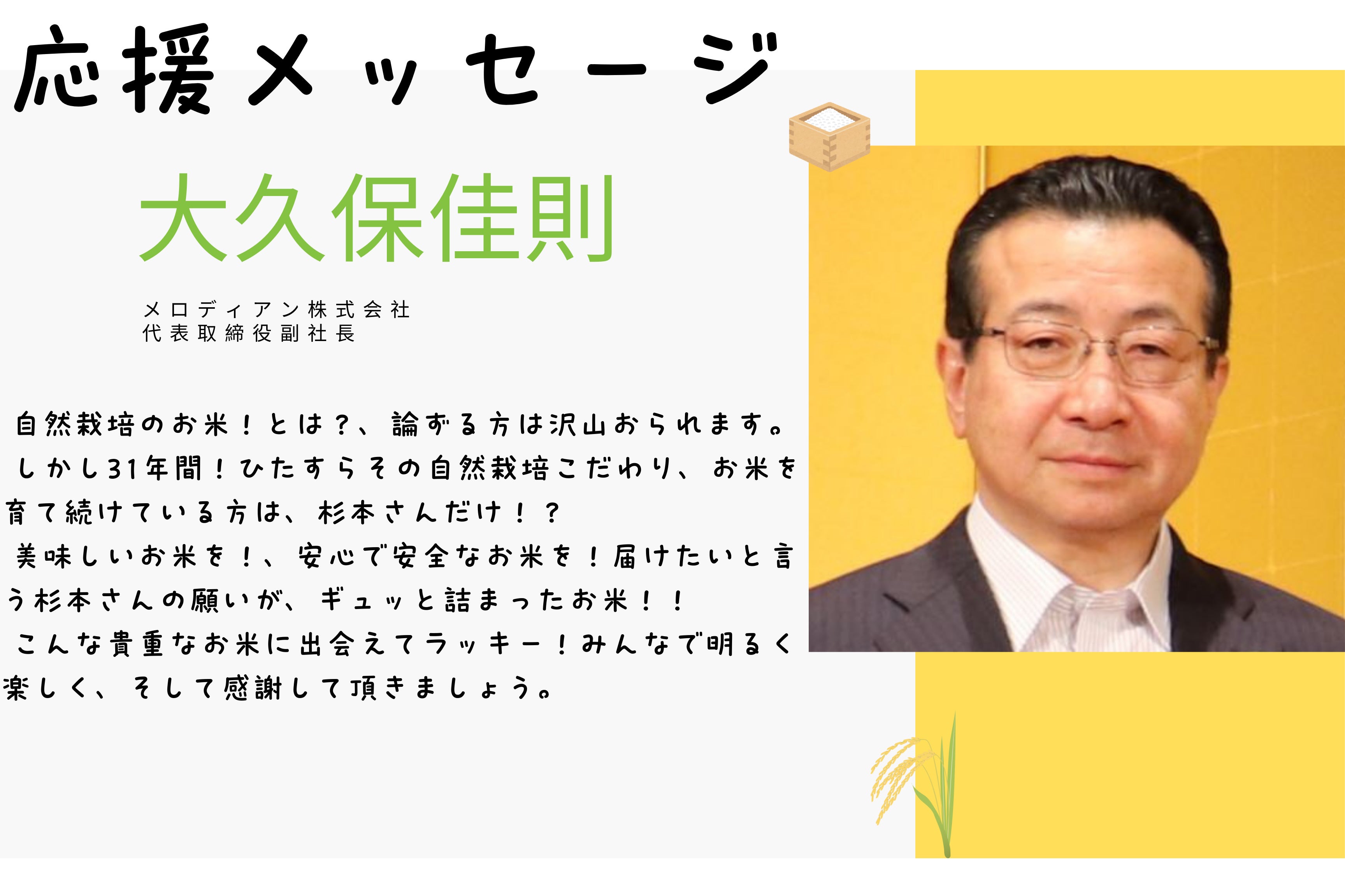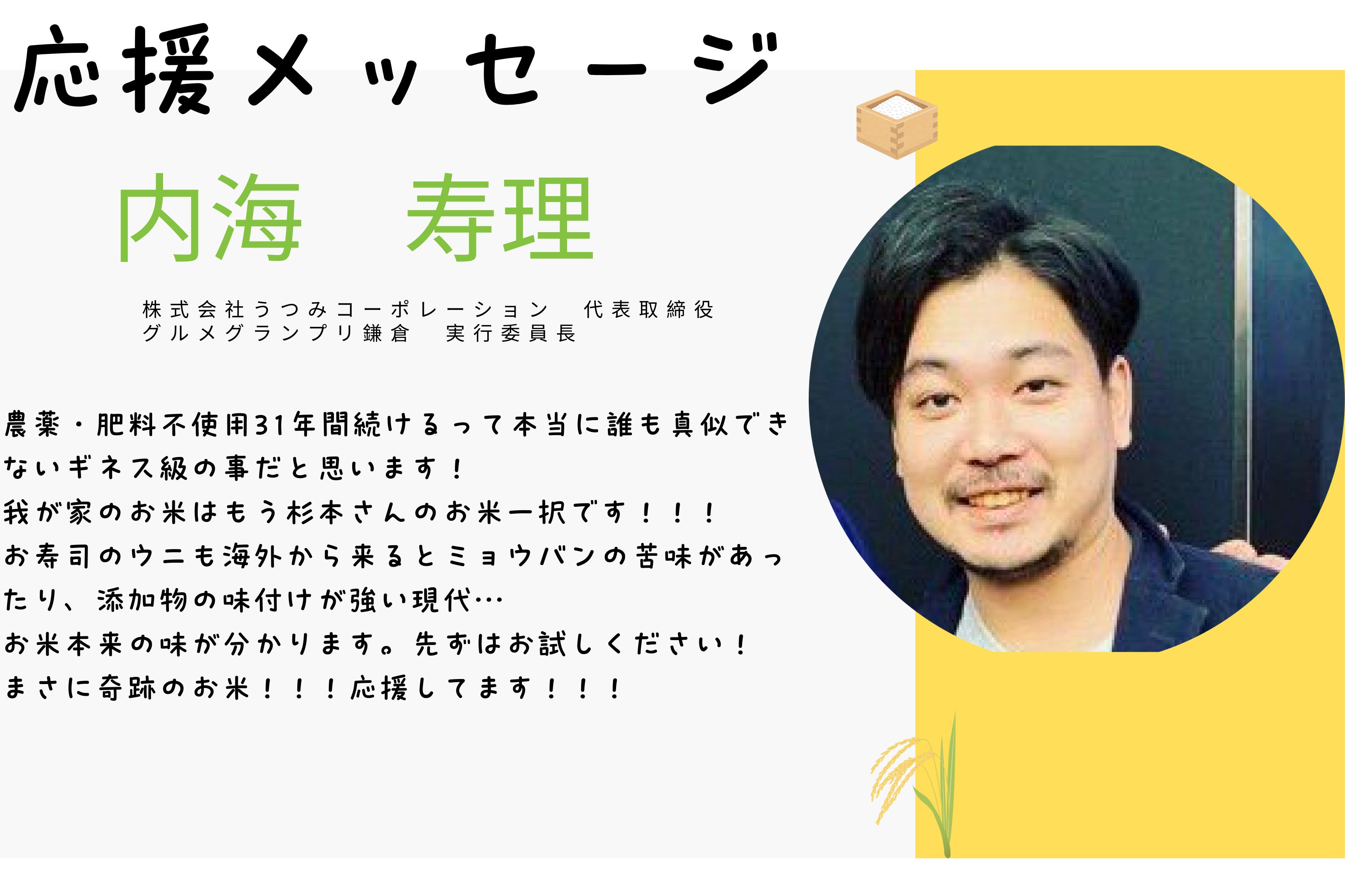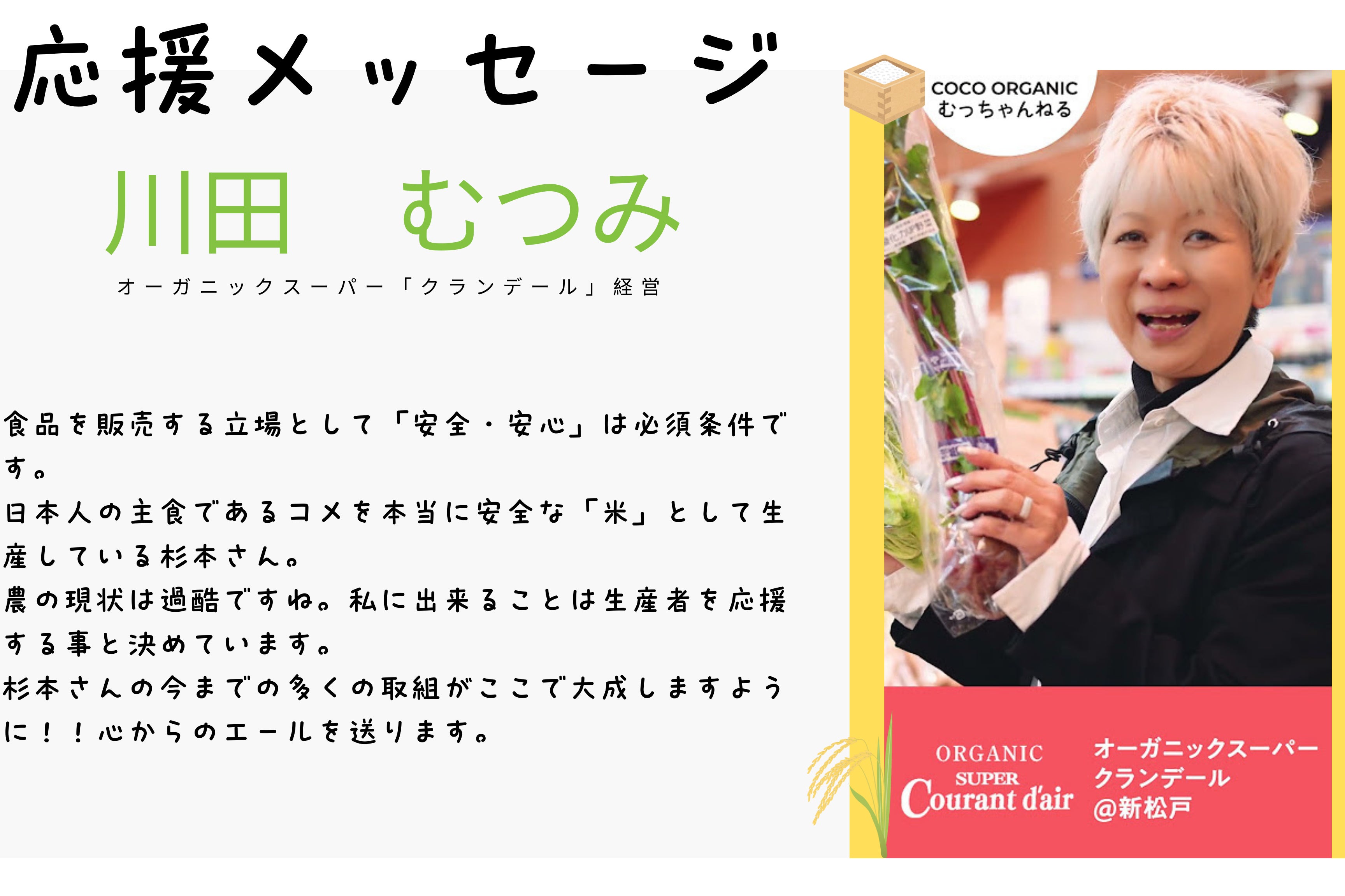 先ず、農家の現実を知ってもらえる事が大事だと思っています。そして、沢山の命の力が宿った自然栽培で作ったお米本来の味が楽しめる、私のお米が皆さまのご家庭に届けば幸いです。安全・安心・美味しいお米を是非ご堪能ください、よろしくお願い致します!