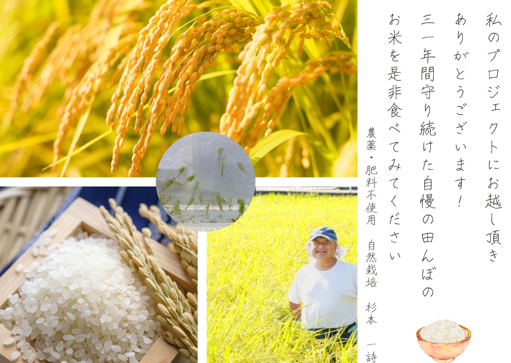 私、杉本一詩は静岡で家業の農家を継いで米作りに携わるようになってから約30年。90年代早々から農薬も除草剤も、そして化学肥料だけでなく有機肥料も使わない究極の自然栽培で米作りを続けております。