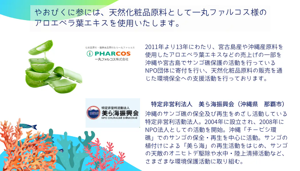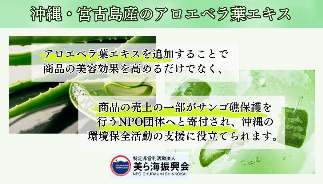 アロエベラを追加することで、商品の美容効果を高めるだけでなく、サンゴ礁保護という社会貢献に。