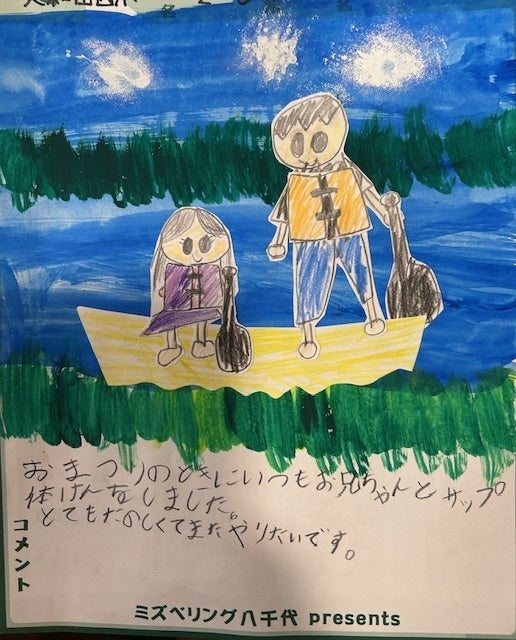 新川沿いで観た花火大会とじゃがバターが思い出に残ったようです。ふるさと親子祭りという名前からも家族の思い出の1ページになったのではないでしょうか。花火の絵はすごく難しいのですが川面に映る描写も素晴らしい(^^♪