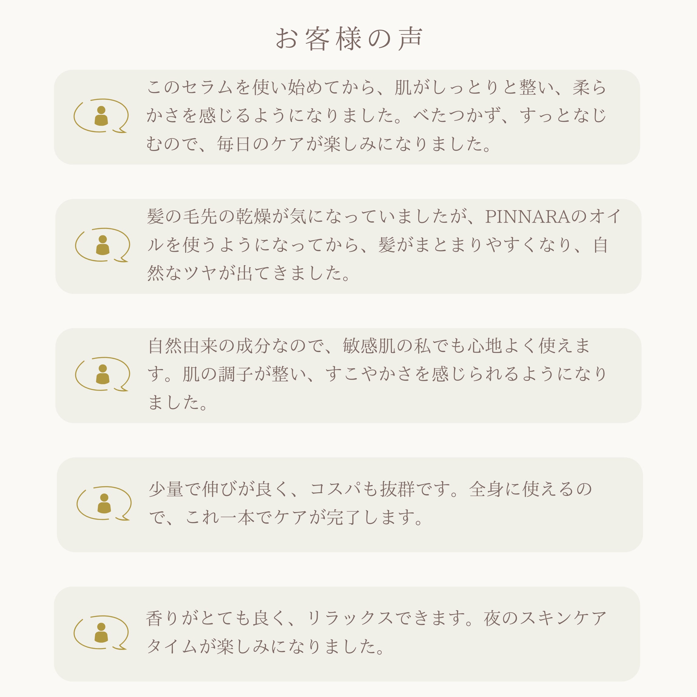 PINNARAの「ココナッツオイルセラム」は、スキンケアとヘアケアに直結する天然成分をたっぷり詰め込んだ、全身に使える万能オーガニックオイル美容液です。