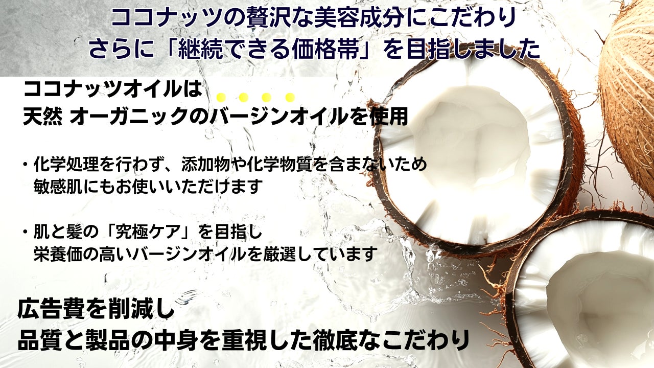・ココナッツの栄養価が最適とされる12か月間で収穫されたバージンオイルを使用