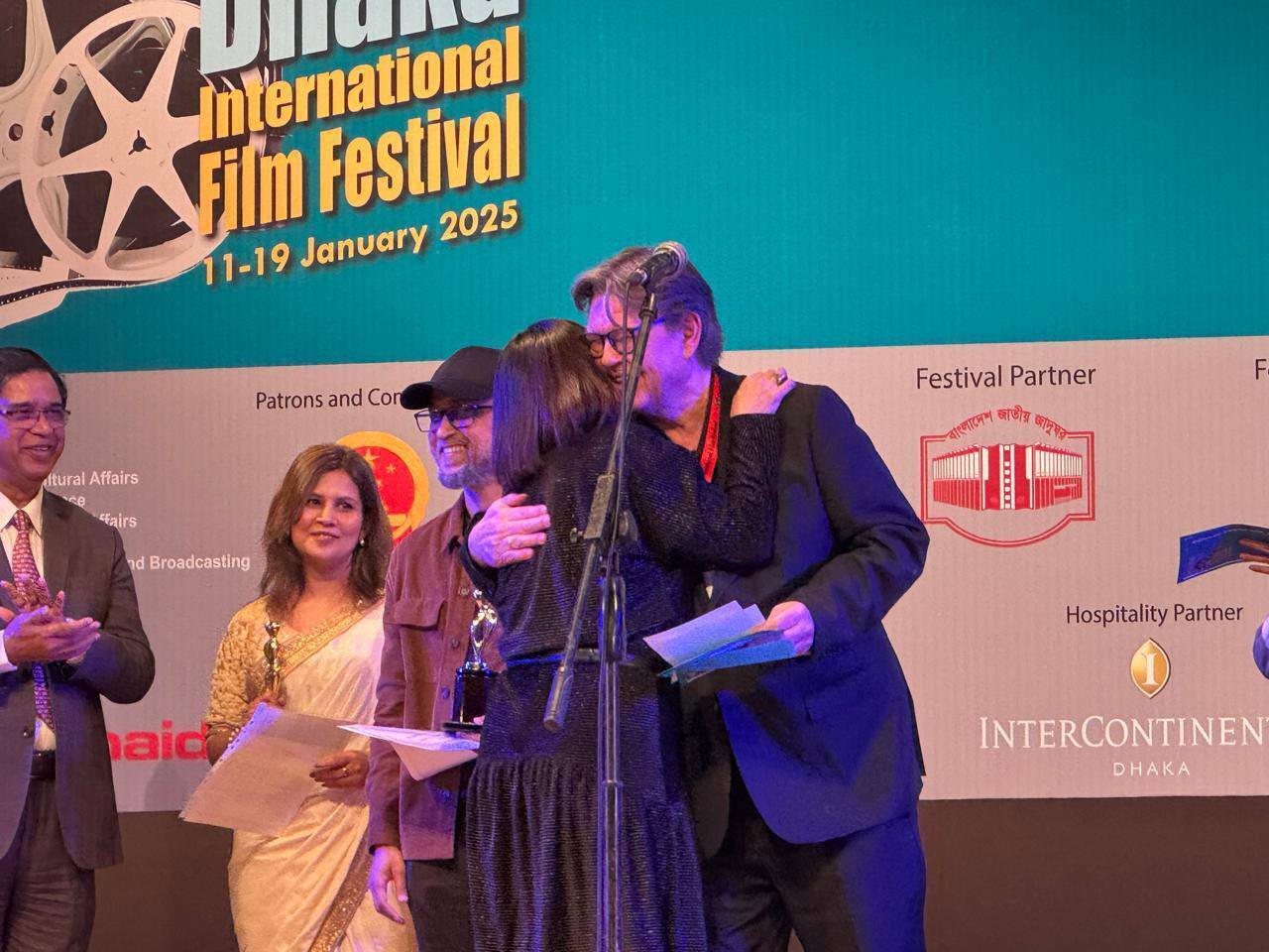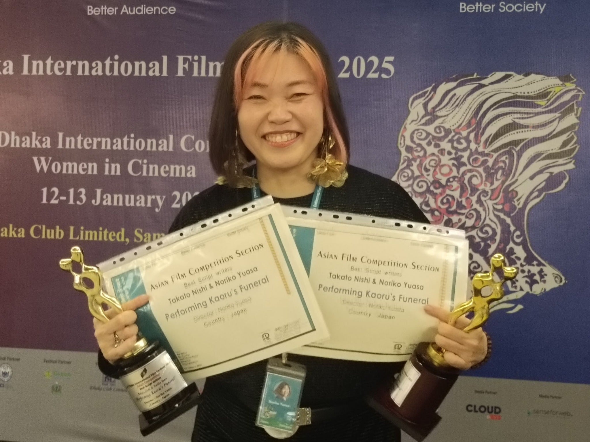 バングラデシュ #ダッカ国際映画祭 #アジアンフィルムセクション にて、『Performing KAORU's Funeral #カオルの葬式』が #最優秀脚本賞 をいただきましたチーフライターの #西貴人 さん、共同脚本も兼ねる #湯浅典子 監督に、現地でトロフィーと表彰状が授与されました。