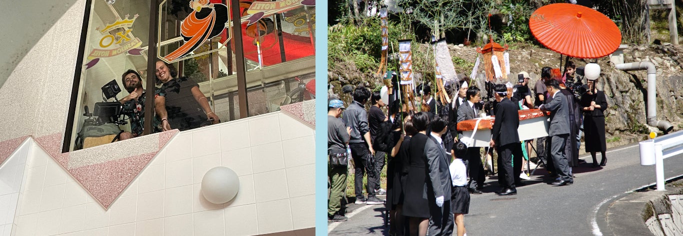 (左)撮影監督のビクターとフォーカスプラーのマリナ/(右)葬列シーンの撮影模様
