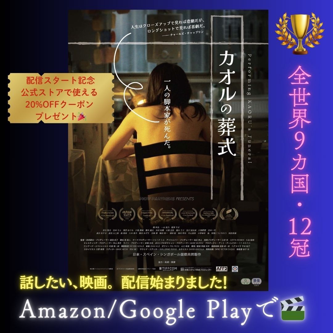 2025/11/02 16:38【配信開始のご報告】クラウドファンディングでご支援いただいた皆様、そしていつも『カオルの葬式 / Performing KAORU's Funeral』を応援いただいている皆様へ。皆様のご支援のおかげで――昨日11月1日より、Amazon Prime Video および Google Play にて国内配信をスタートいたしました!昨日、映画ドットコム(Yahoo!ニュース)でも発表されました!https://news.yahoo.co.jp/articles/970a8aa15728ead9fc522352a54532031d3b958b今後の国内外展開についても掲載いただいていますので、ぜひご覧ください。配信情報Amazon Prime Videohttps://x.gd/z4V6WGoogle Playhttps://www.youtube.com/watch?v=62wVbOHLuzcこれまでの歩み世界9カ国12冠を達成。大阪アジアン映画祭 JAPANCUTSアワード受賞、ダッカ国際映画祭ほか、世界各国で上映されました。国内では 10ヶ月にわたるロングラン上映 を記録。今回初めて、完全字幕なしでの配信 となります。 応援いただいている皆様へ、感謝を込めて配信記念として、公式ストアで使える20%OFFクーポン をご用意いたしました。クーポンコード:KAORUHAISHIN有効期限:11月30日 23:59まで※お一人様1回限り公式ストアhttps://kaorunosoushiki-2025.stores.jp/元妻が遺した「喪主は元夫に」という最後の言葉から始まる、家族と“死”をめぐるユーモアと深み。皆様のご支援があったからこそ、この作品を多くの方にお届けできる日を迎えることができました。劇場から配信へ、そして世界へ。『カオルの葬式 / Performing KAORU's Funeral』は、新たなステージへ進んでまいります。今後とも、どうぞよろしくお願いいたします。—『カオルの葬式 / Performing KAORU's Funeral』製作チーム一同最新情報はこちらInstagram https://www.instagram.com/performing_kaorus_funeral/その他公式SNSでも随時発信中です。今後の展開も、ぜひお楽しみください! もっと見る