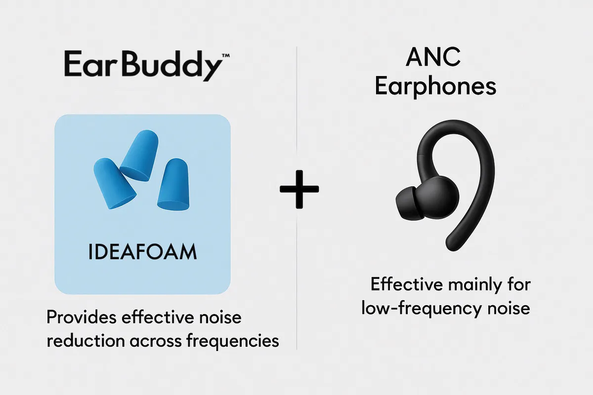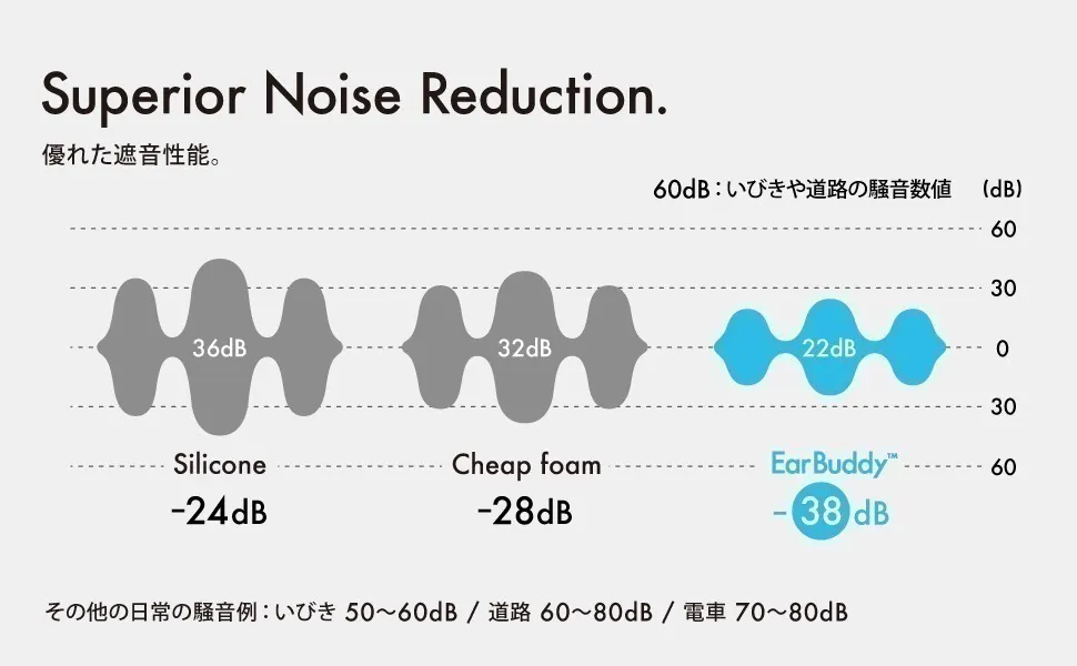 対してEarBuddyは、同じく低周波に加え、いびき・話し声・足音・ドアの音など中高周波の騒音にも強いのが特長。ノイキャンだけではカバーしきれない音も、しっかり遮音します。
