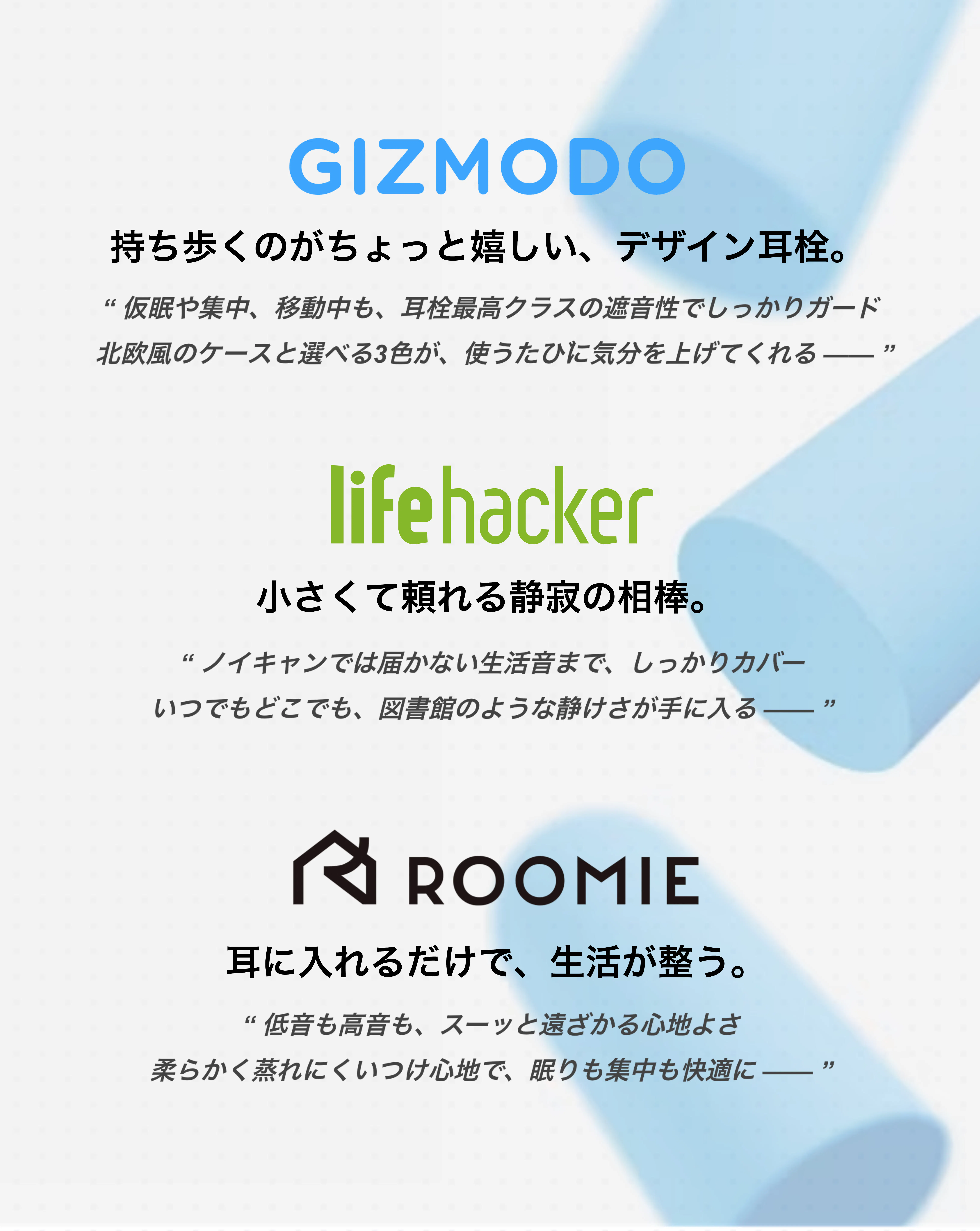 もちろん、「つけ心地」にもこだわりました。まるでマシュマロのようにやわらかく、羽のように軽いIDEAFOAMが、あなたの耳の形に沿ってゆっくりと膨らみ、優しくフィット。つけているのを忘れるつけ心地で、長時間つかっても痛くならず、寝返りをうっても外れにくい設計です。
