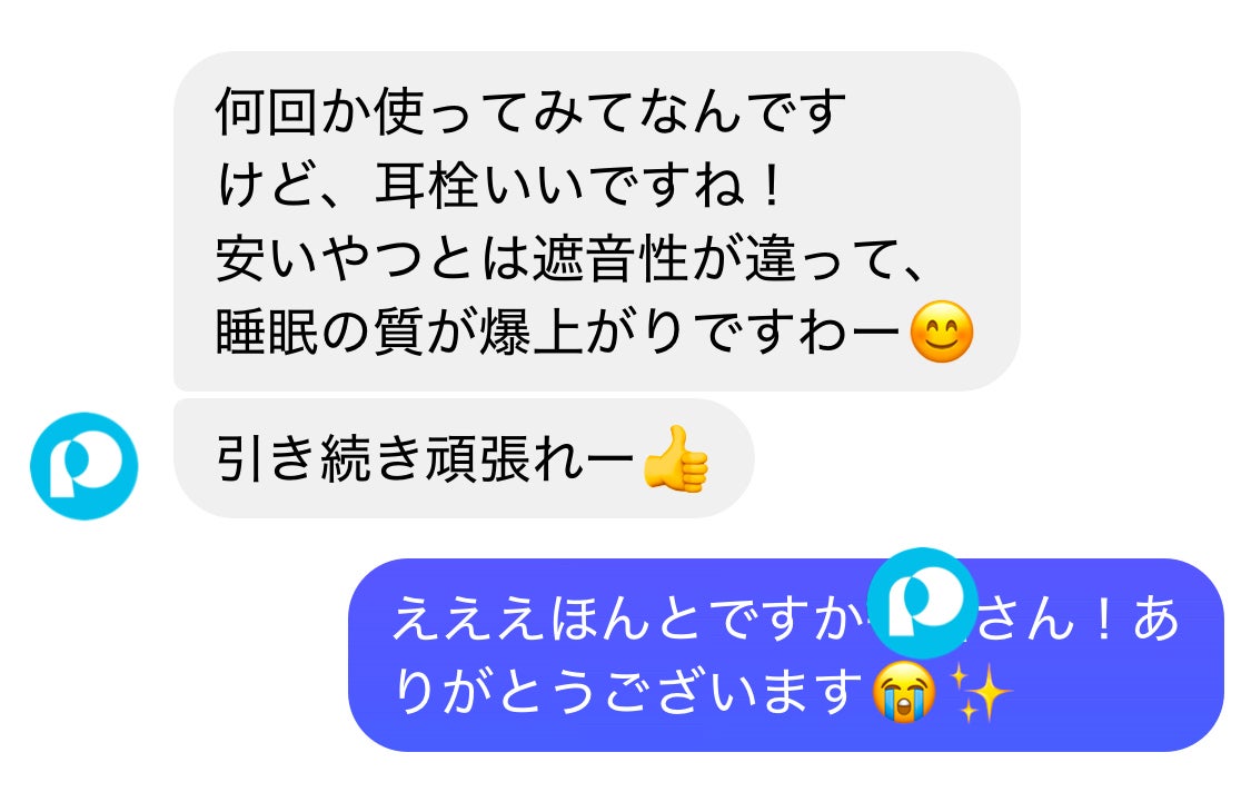 「何回か使ってみてなんですけど、耳栓いいですね!安いやつとは遮音性が違って、睡眠の質が爆上がりですわー!」