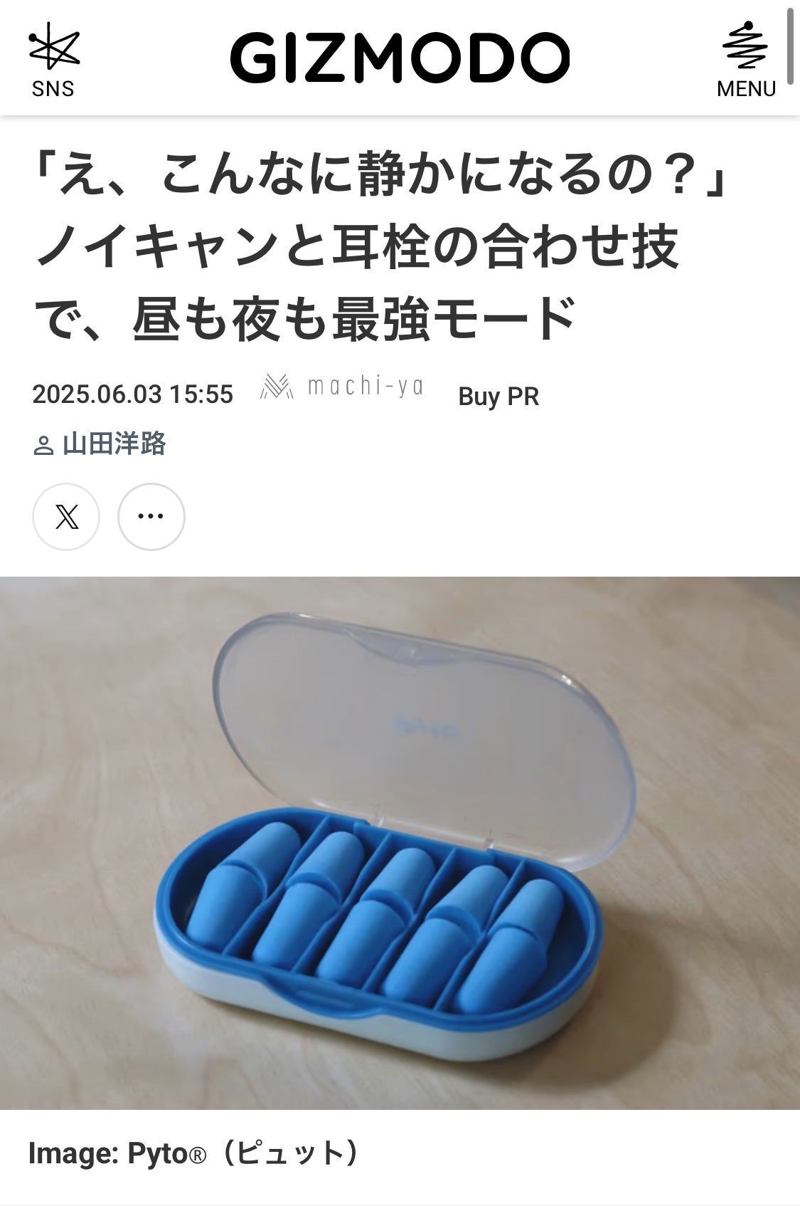 おはようございます!Pyto代表の直林です。関東は久しぶりの晴れ空で、気持ちのいい朝です。さて、なんとEarBuddyが、公式YouTube登録者数90万人、月間PV2,600万を超える大手ガジェットメディア、「GIZMODO JAPAN(ギズモードジャパン)」に掲載されました!!「え、こんなに静かになるの?」というEarBuddyの耳栓としての高い遮音性がわかるキャッチと、ノイキャンと一緒に使える切り口でご紹介頂きました。当たり前かもしれませんが、やはりプロのライターさんは、タイトルのセンスも記事の語り口調も、読みやすいだけでなく、グッと引き込まれて本当にすごいです。笑EarBuddyは耳栓として、夜の睡眠時だけでなく、移動中やパワーナップ(昼寝)、リラックス時など、毎日のさまざまなシーンで活躍します。ぜひ、記事をチェックしてみてください!▼ギズモードジャパン掲載記事はこちらギズモード・ジャパン今日はお昼は少しジメジメするかもしれませんが、1日がんばりましょう。私もEarBuddyと一緒に頑張ります。引き続き応援、よろしくお願いいたします!Pyto代表 直林