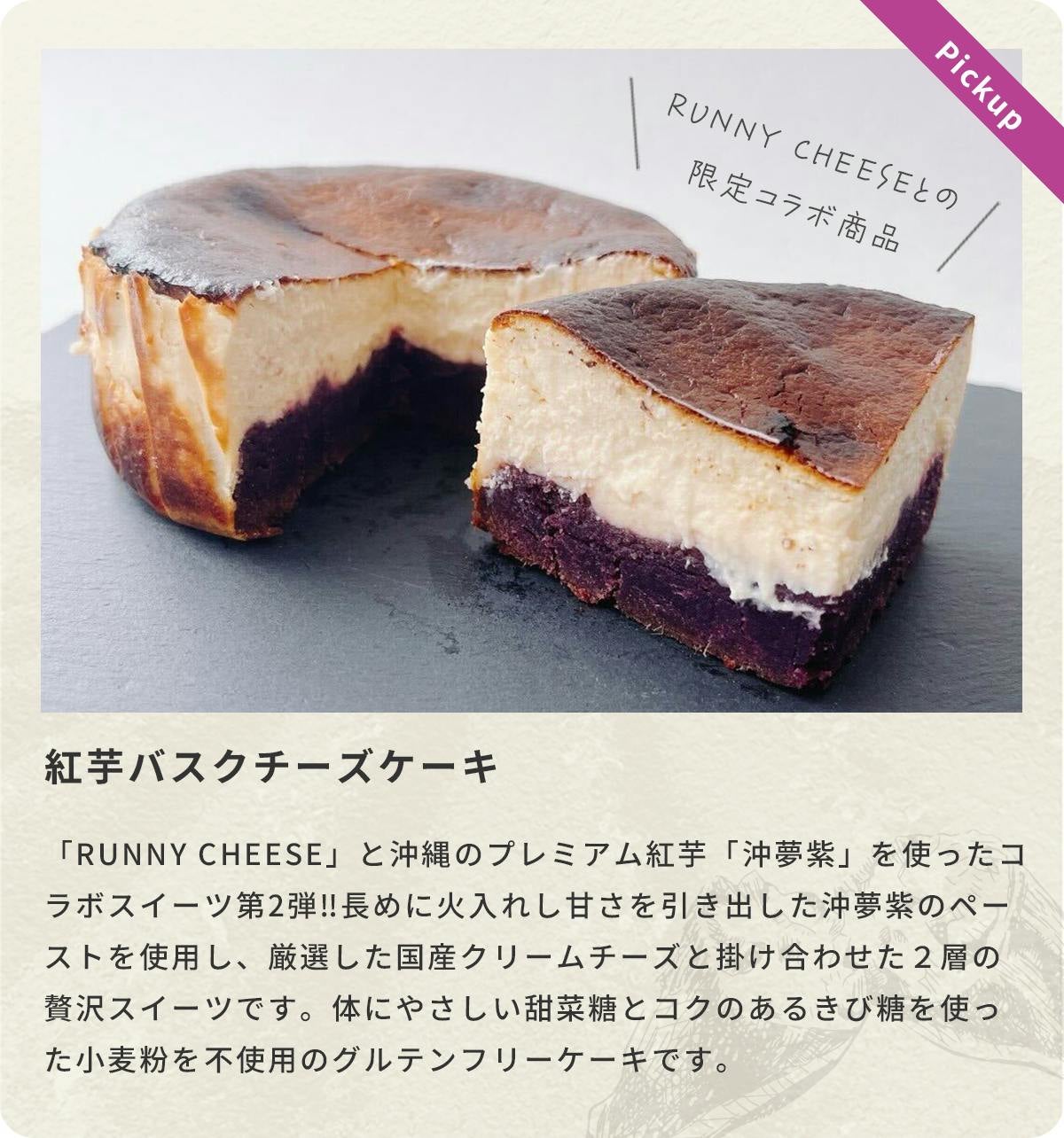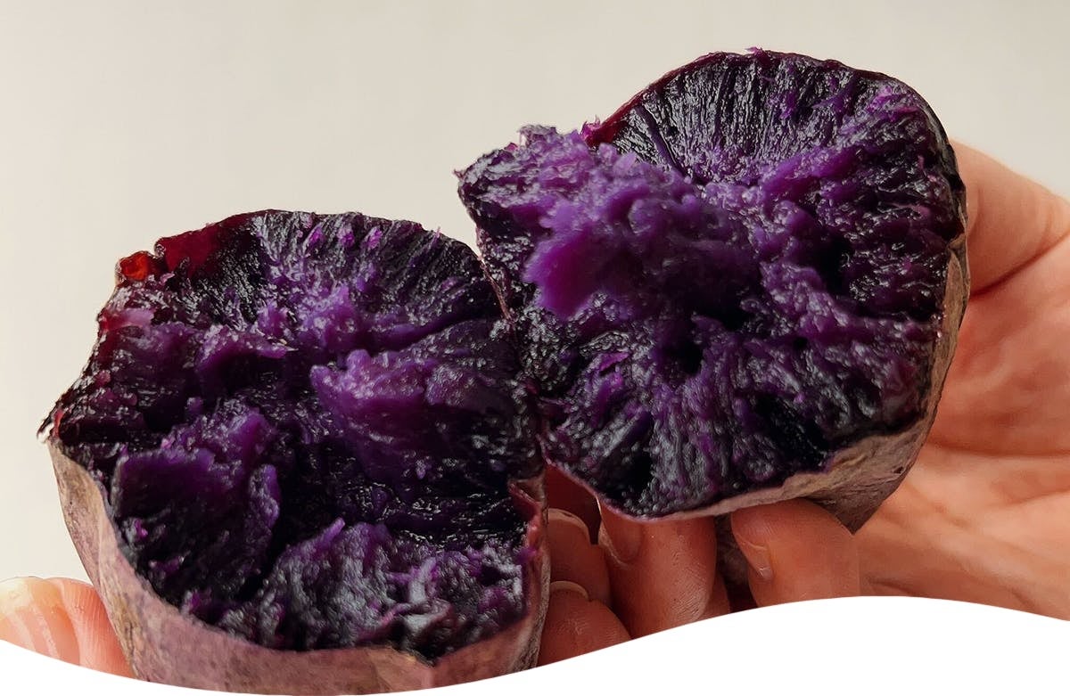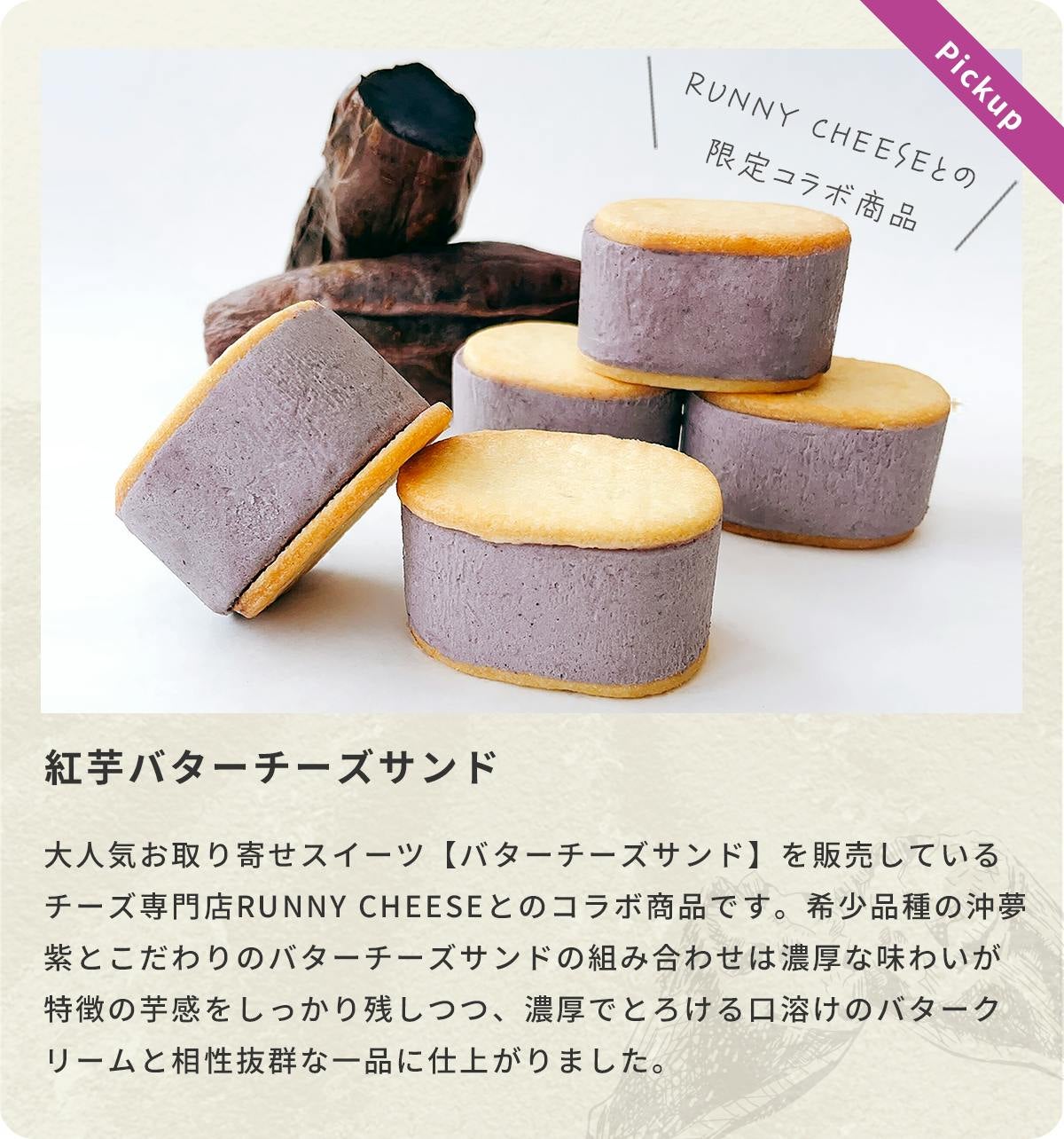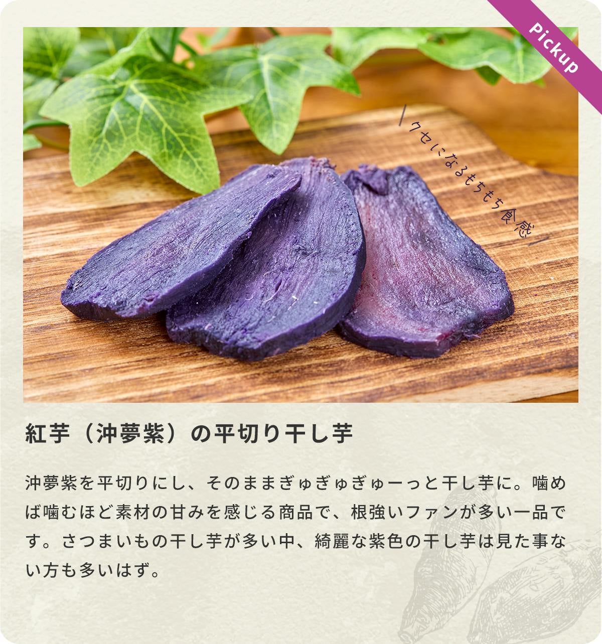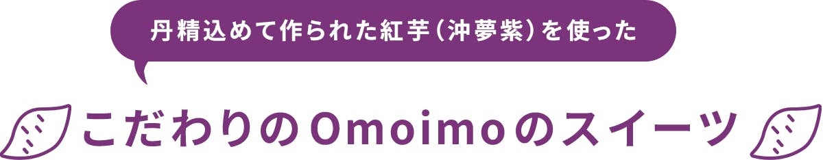私たちが取り扱っている紅芋は《沖夢紫》という品種で、紅芋の中でも栽培が難しく生産量が限られている希少な品種です。沖夢紫は、他の紅芋と比べてもお芋そのものに甘さがあり、サツマイモとひけを取らないほど糖度があります。Omoimo では、そんな希少な沖夢紫をそのまま味わえる焼き芋や干し芋にしています。焼き芋や干し芋といえば黄色いサツマイモを連想する方が多いと思いますが、沖縄でも紅芋の焼き芋や干し芋はめずらしく、ありそうでなかった一品です。他にも、人気スイーツ店とコラボした限定紅芋スイーツにも沖夢紫を使用しています。