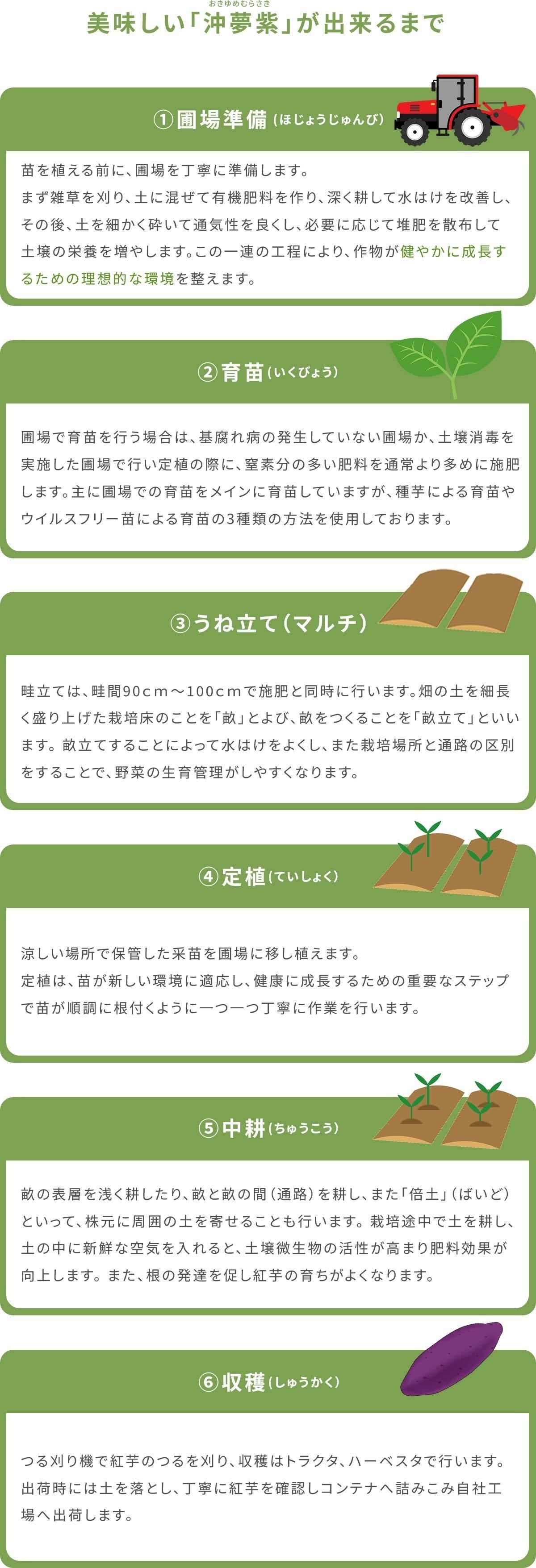那覇から西に100km、飛行機で30分の距離に位置する久米島は紅芋の拠点産地。かつてアリモドキゾウムシという病害虫の根絶が世界で初めて確認され、紅芋生産を牽引してきた久米島。水はけの良い土壌は紅芋栽培にも適した土地です。手間や費用をかけてつくったいい土ほど粒子が細かく、雨で海へ流されてしまい赤土流出という環境問題へと繋がってしまう為、久米島町では農地に防止板の設置やグリーンベルトの植栽を行う等で流出防止対策にも力を入れています。紅芋拠点産地としても沖縄の綺麗な海や珊瑚礁をを守る工夫をしています。