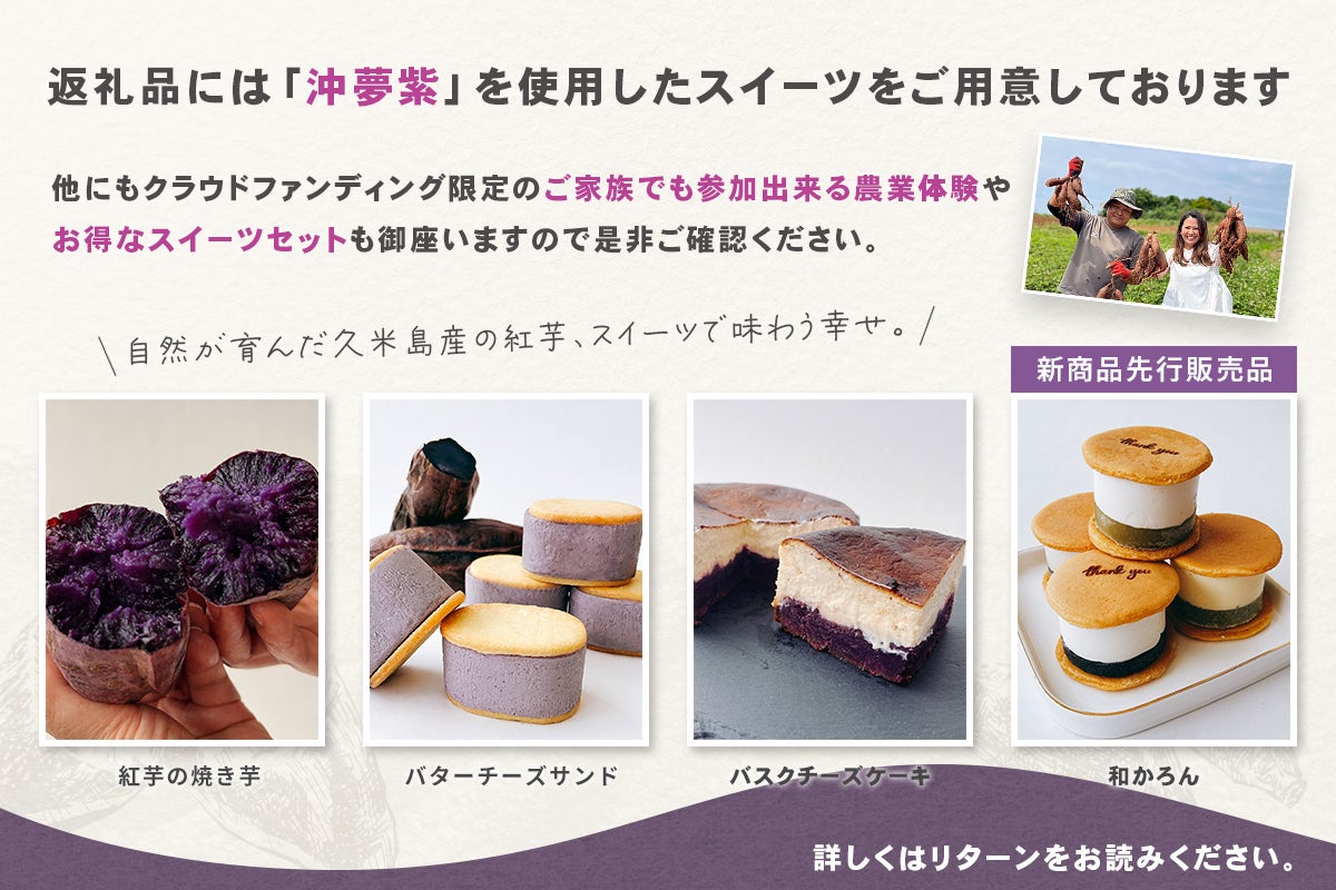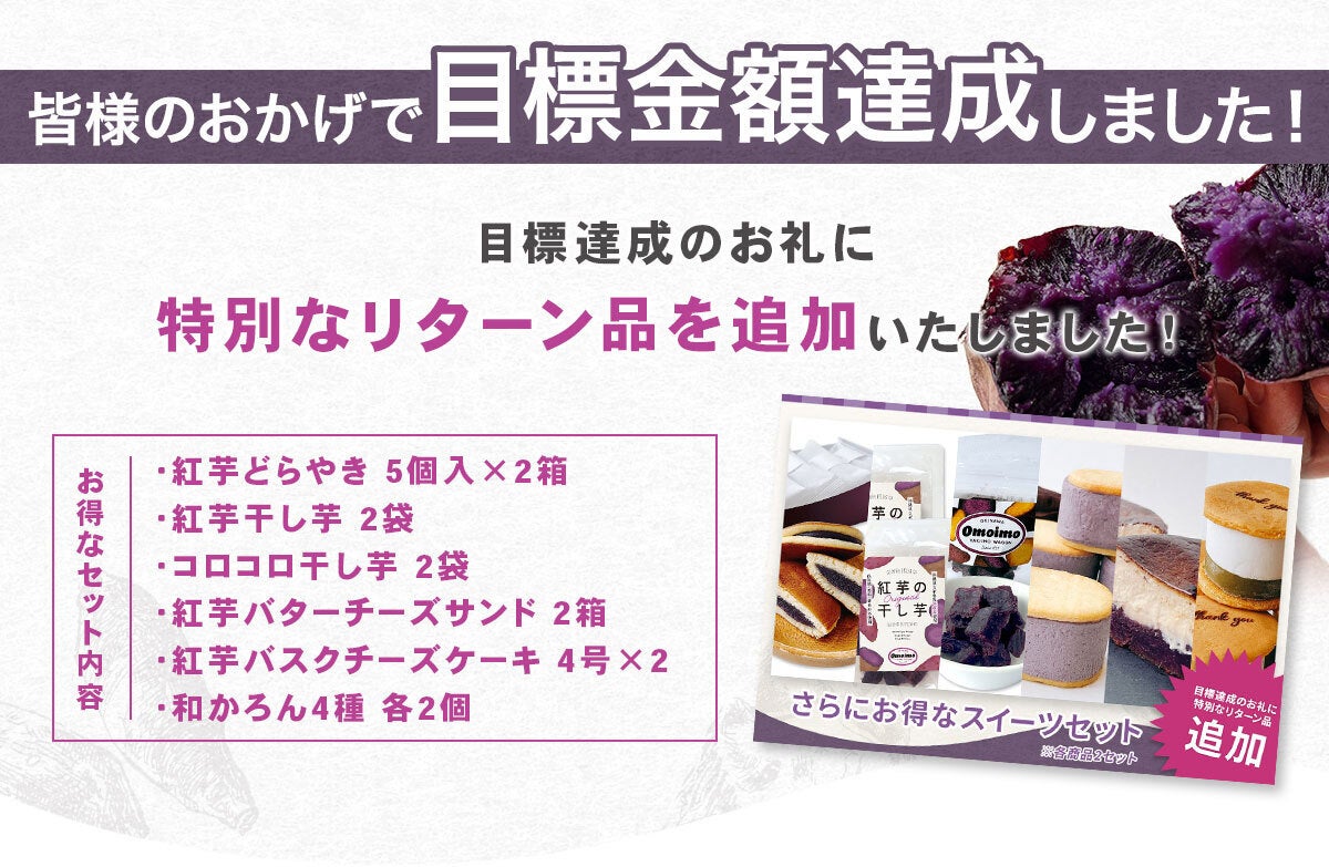 今回の達成を記念し、そして感謝の気持ちを込めて、さらにお得なスイーツセットをリターンとして追加いたしました。沖縄の希少紅芋「沖夢紫」を贅沢に使ったスイーツの詰め合わせを、特別価格でご提供させていただきます。詳細はクラウドファンディングページでご確認ください!