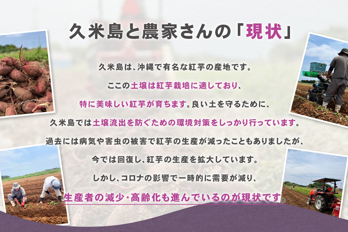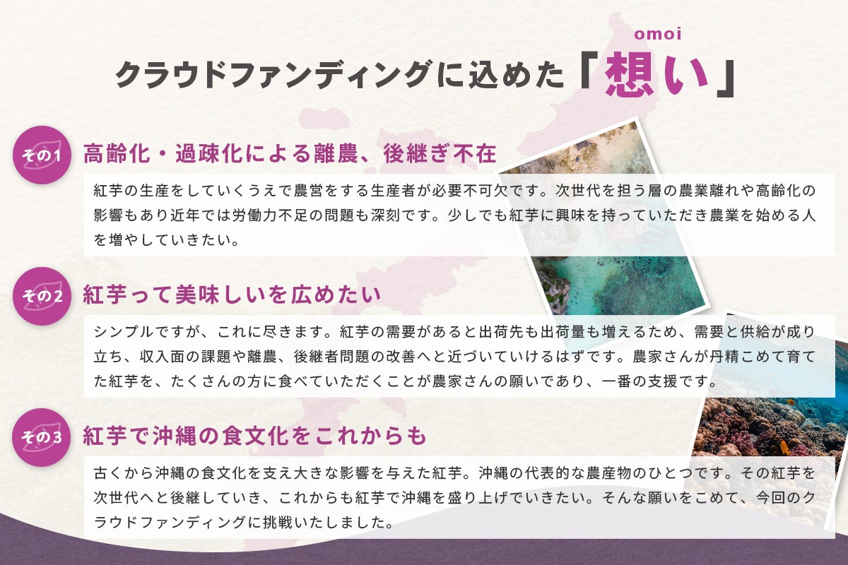 古くから沖縄の食文化を支え大きな影響を与えた紅芋。沖縄の代表的な農産物のひとつです。その紅芋を次世代へと後継していき、これからも紅芋で沖縄を盛り上げでいきたい。そんな願いをこめて、今回のクラウドファンディングに挑戦いたしました。