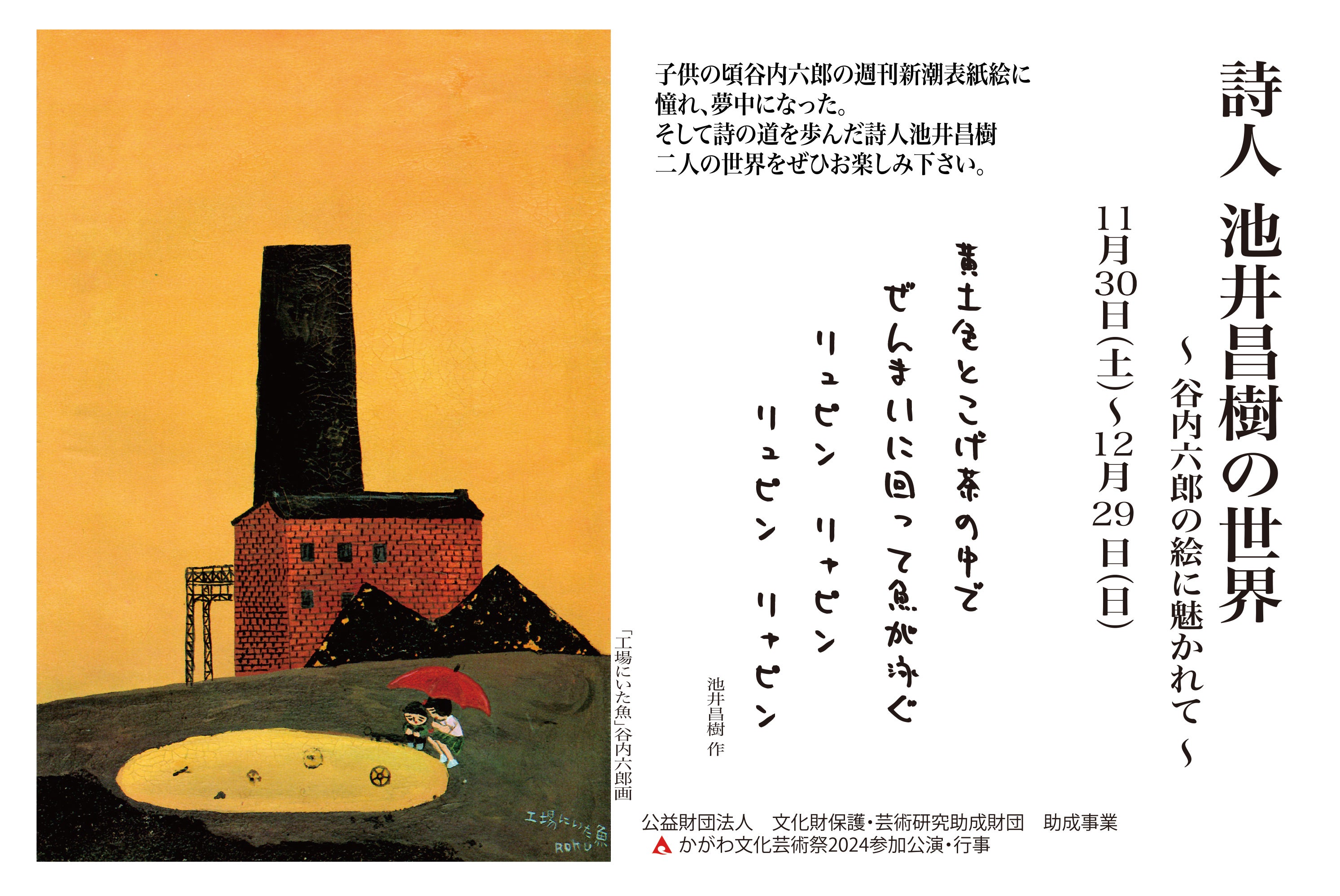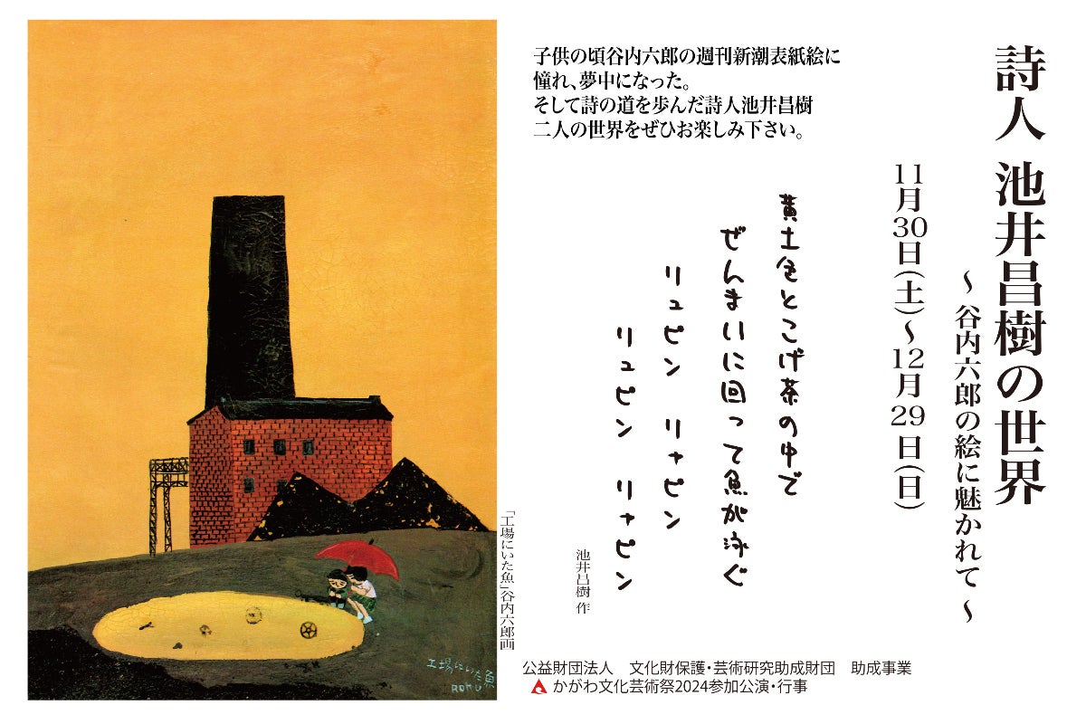 坂出市出身の池井昌樹さんを地元の人にもっと知ってほしい。彼が子供の頃から夢中になった谷内六郎画伯の週刊新潮の表紙絵、それに魅せられて作った詩の数々。この展覧会で懐かしい昭和の時代を絵と詩二つの異なる芸術表現でお見せします。