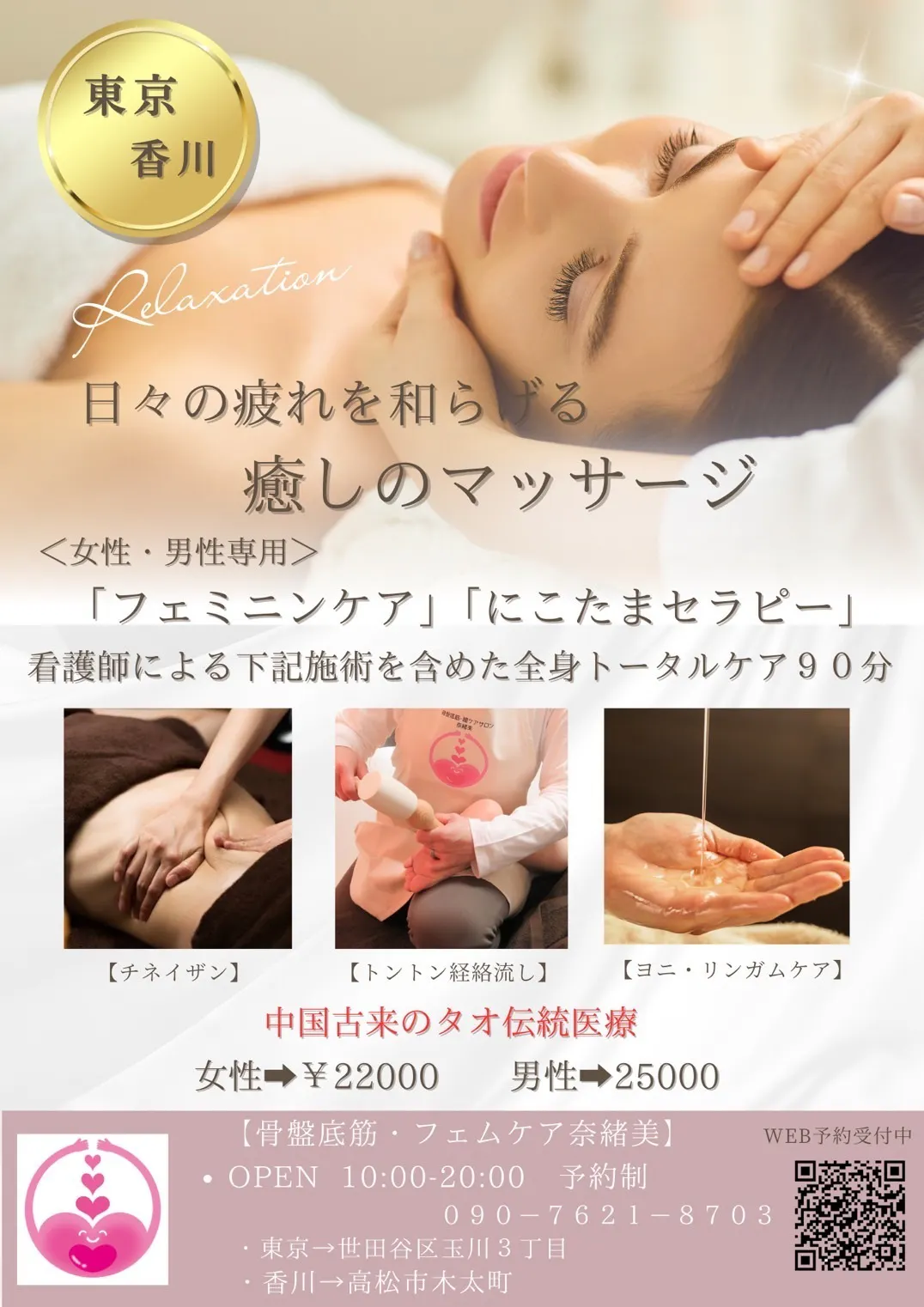 私、八田奈緒美による90分の、中国古来のタオ伝統医療「チネイザン」を含めた身体と心から全身を整えるフェミニンケア施術体験です。