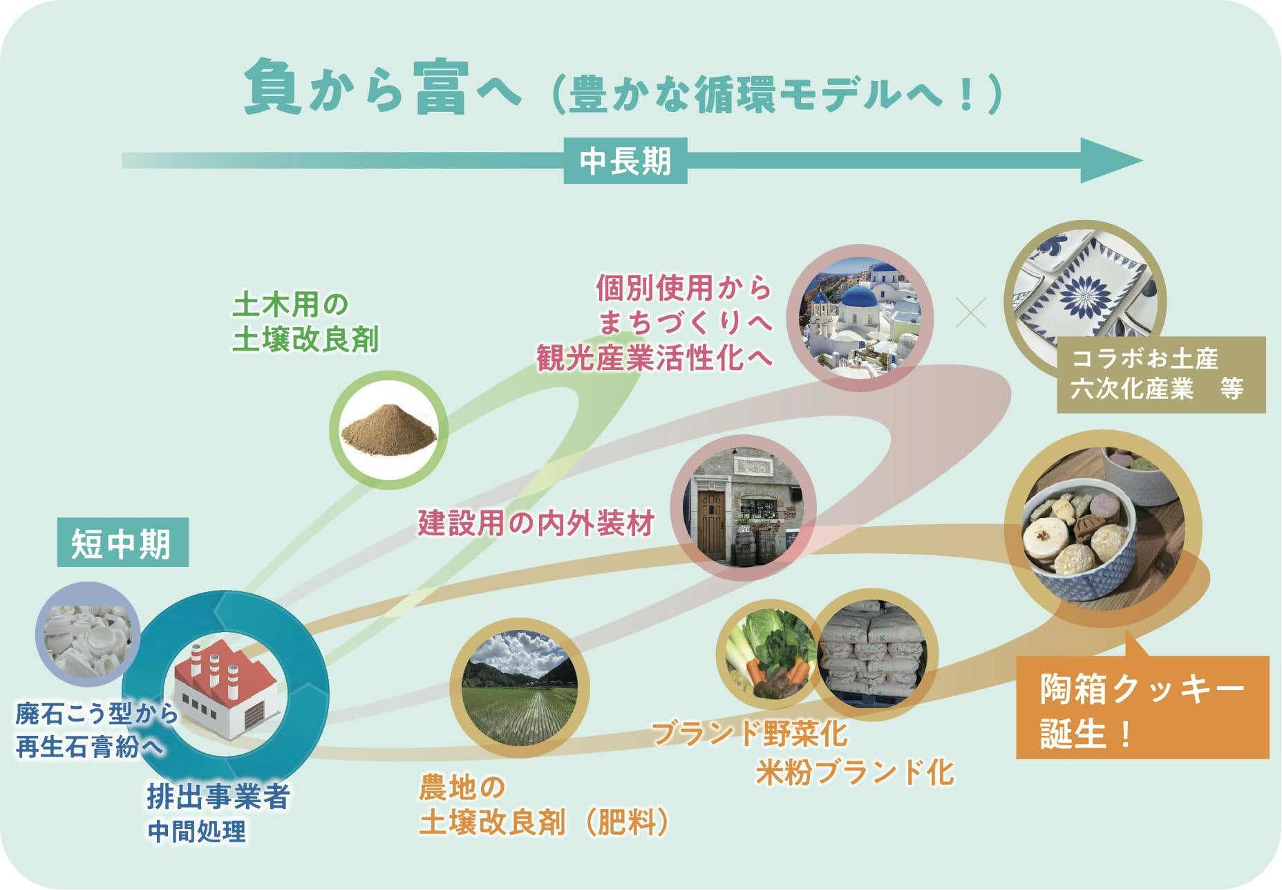 ここ数年で25年来の問題を地域内循環モデル「循環のわ」を構築し、解決していこうと考えています。地域内循環モデルの取組みでは要らない物(負)から価値のある物(富)を作り出す仕組みとして、廃石こう型を再生石膏粉にし農地用の副さん肥料に利用したり、建設用の内外装材にすることで観光資産にしたり、更には土木材の利活用などアップサイクルな活用が広がっているところです。また、副さん肥料により収穫された米粉を使った陶箱クッキーやポン菓子ショコラなどが生まれ、価値の増幅に繋がっています。このような取り組みを皆さんに知っていただき、波佐見町をもっと好きになってもらうためにも2020年からサスティナブルなコトづくりを支援するイベントを開催しています。