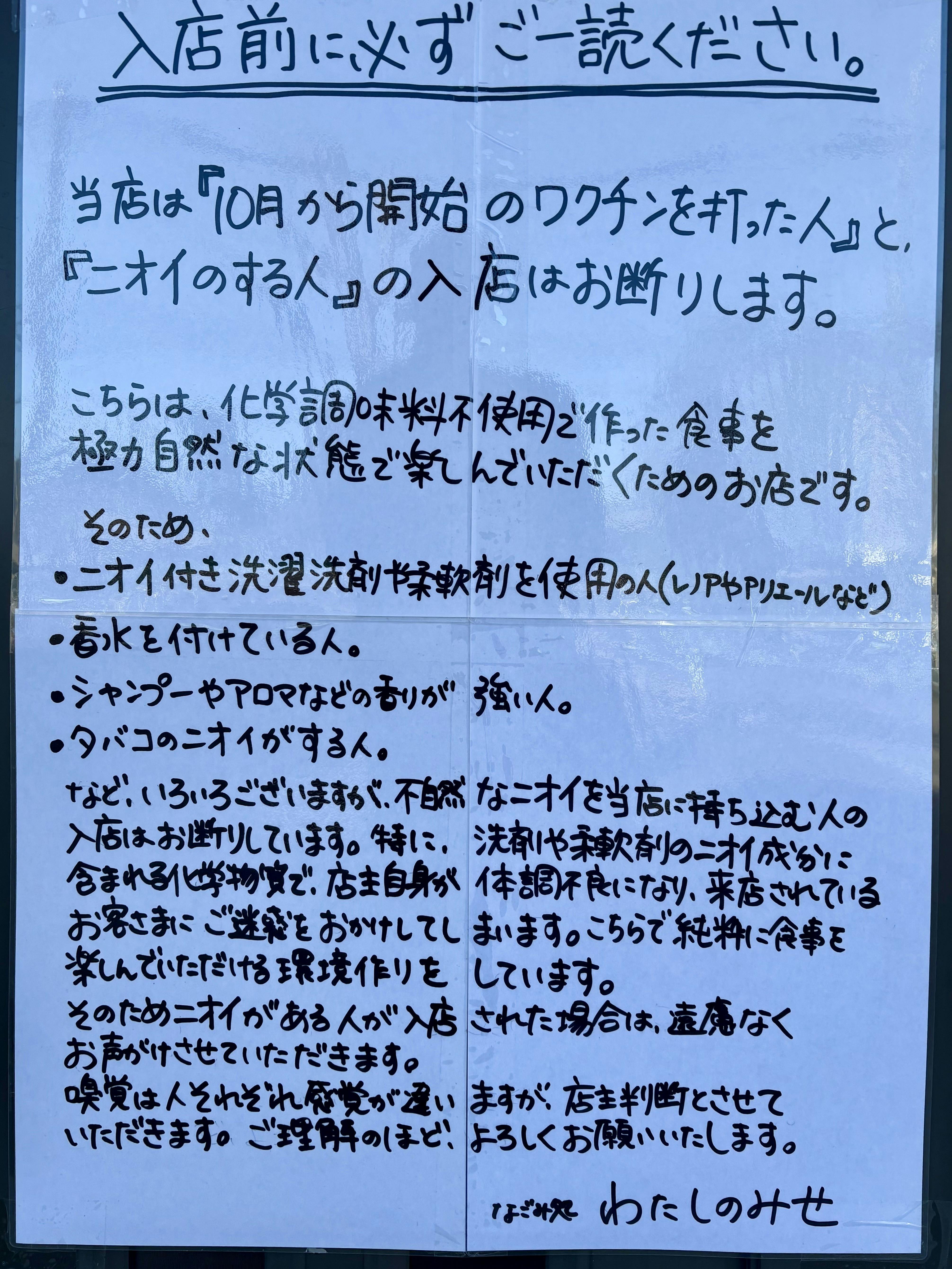 さらに、店頭の掲示を見てご自身のニオイを確認して入店されなかった方、ご協力に感謝します。皆様のご協力により当店は運営することができます。ご自身が大丈夫か迷われた方は、当店はなぜかインターホンが設置されておりますので、お気軽にお呼びください。