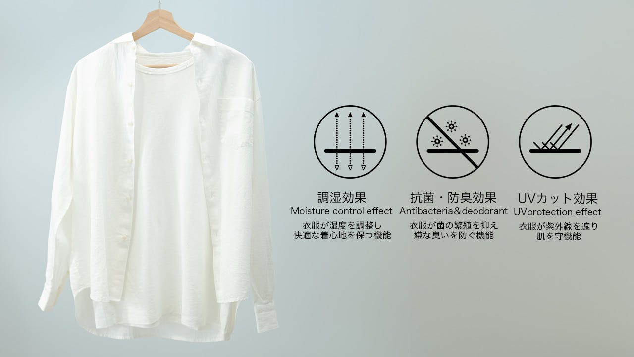 和紙素材ならではの高級感ある純白なデザインであり、抗菌・防臭効果・調湿効果・UVカット効果機能を兼ね備えた、長時間着用など日々のハードワークにも耐えられる高機能シャツに仕上がりました。
