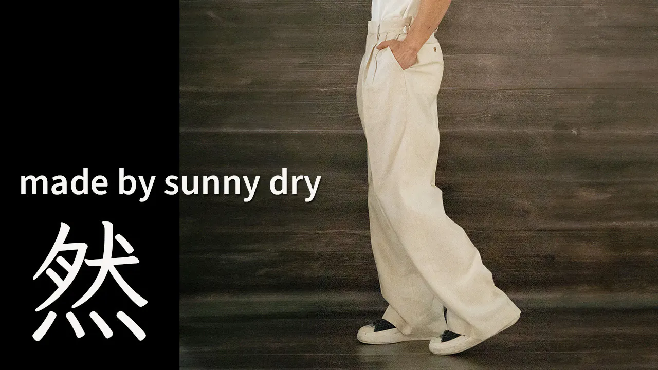 スラックスパンツ然(ぜん)は太陽光の恵みをたっぷりと受け、自然の風を利用して乾燥させているため独自の色や風合いを出した生地になっております。乾燥段階で機械を使わないことで、排水量・電気・蒸気・ガスなどの使用料が減るため、エネルギーの削減ができCO2排出量の削減につながっています。私たちはこのプロジェクトを通じて、ファッション業界が人にも地球にも優しい環境型のビジネスに変革するきっかけを発信していきます。