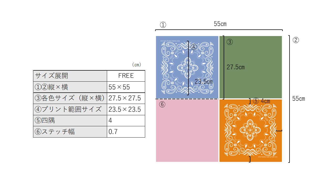 一般的なバンダナのサイズは“53㎝×53㎝”ですが、エクレクトオリジナルバンダナ【Bandana 結】はトータルコーディネートの中心的存在として映えるように“55㎝×55㎝”と一回り大きめのサイズに仕上げました。