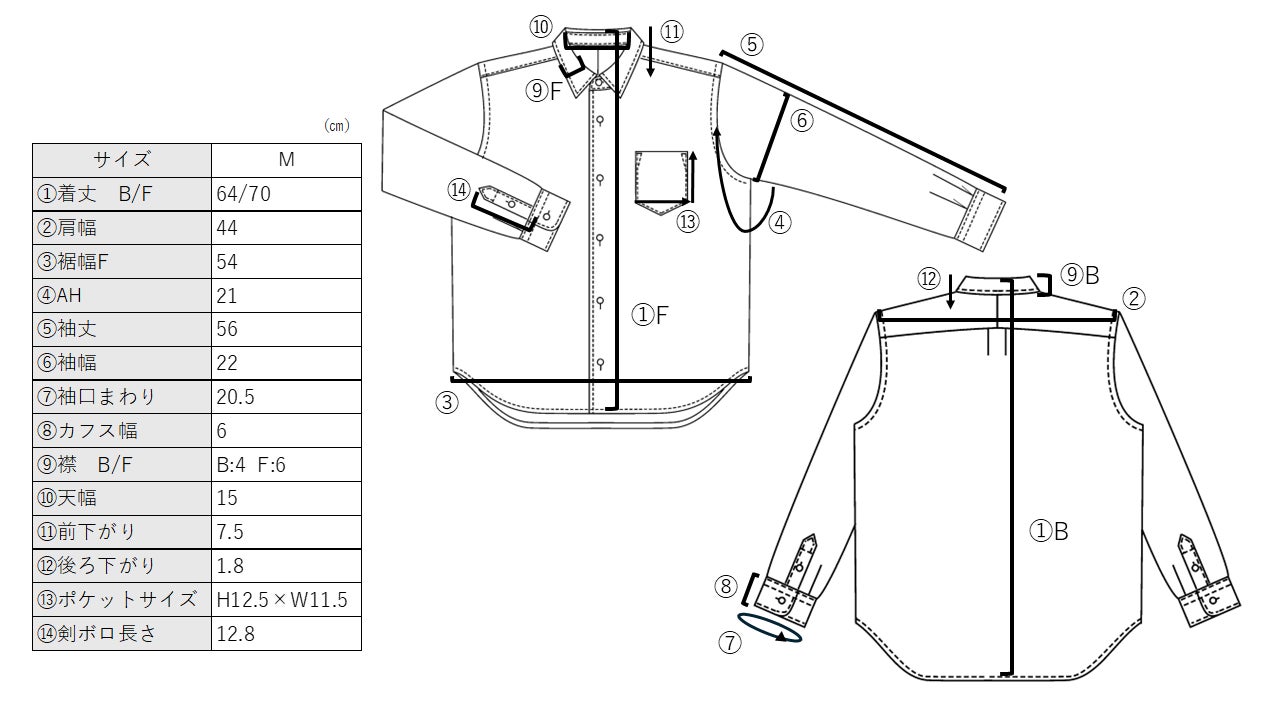 身幅が66.4cmとビジネスシャツに比べると広めとなっていますが、アームホールにかけてカフスまでに伸びる腕部分がスリムになっていく設計となっています。その為、ダボっと感が出過ぎずにメリハリのあるコーディネートを組む事が可能です。ワンランク上のおしゃれなビジネスシーンにご活用ください。