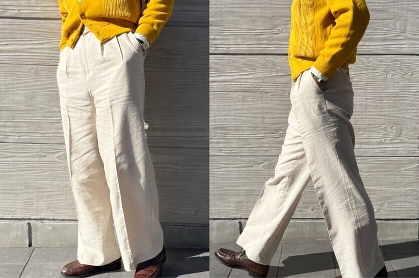 生成り色の天日干し生地を使用した“スラックスパンツ 然(ぜん)”を主役にスタイリングしました。