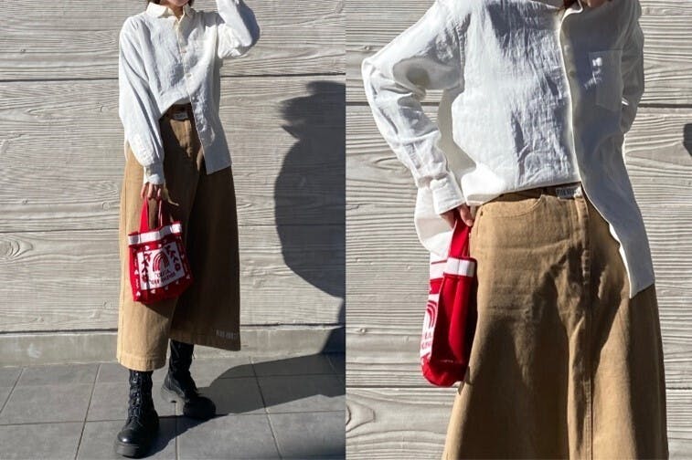 フロント部分の片側をインするとウエスト位置が高く見え、脚長効果に繋がります。ロングスカートとの相性が良くオススメな組み合わせです。