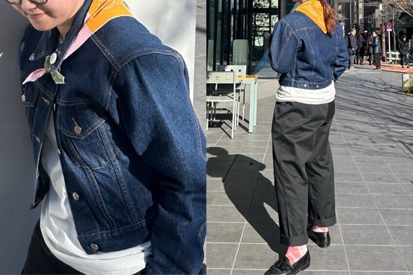 そして、首元には今回のコーデの主役の“オリジナルバンダナ 結(ゆい)”をセーラー巻きにし、4色あるうちの老竹色(グリーン)&撫子色(ピンク)の組み合わせをチョイス。また、ソックスにピンクを加えることで多色カラーのスタイルにまとまり感を演出しています。