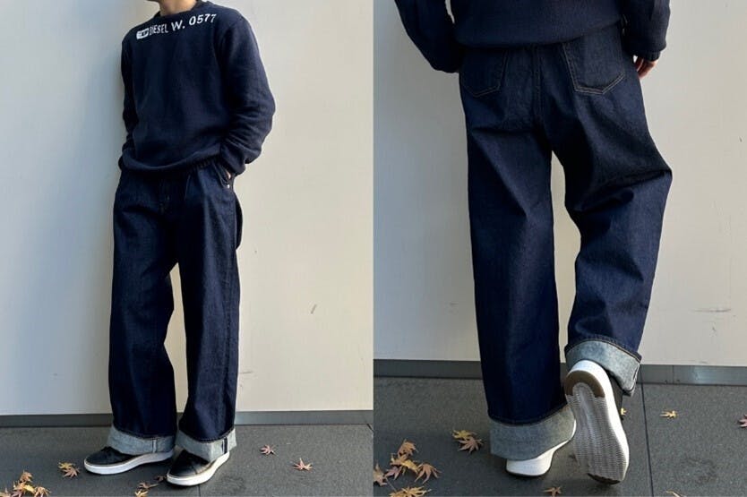 また、ロールアップをすることでデニムの赤ミミがちらっと顔をだし、デニムとしてのスタンダードなカッコよさもバランスよく演出してくれるのもポイントの一つです。